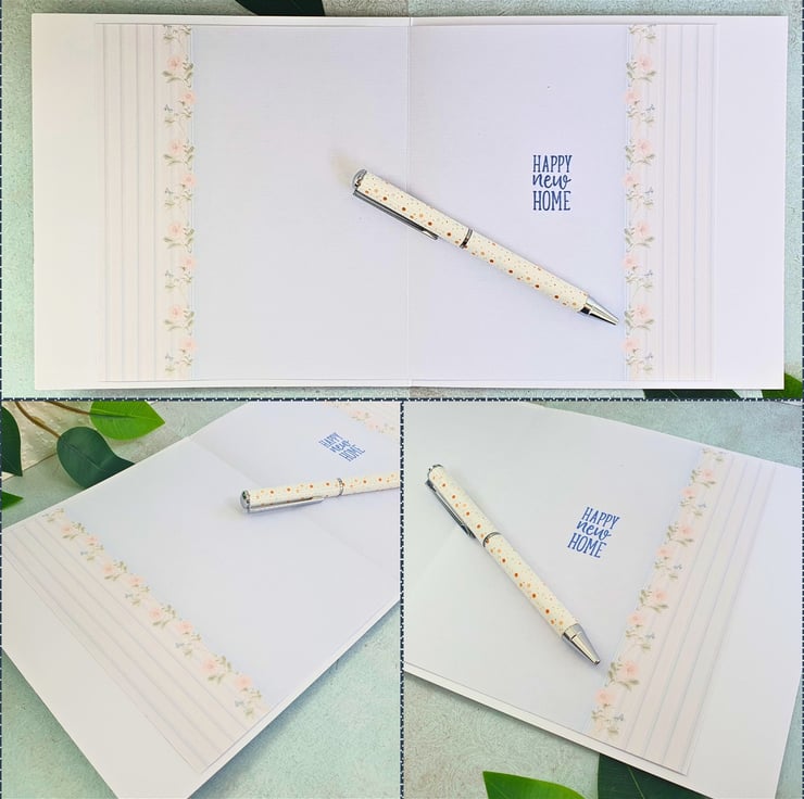 It is finished with a double, coordinating insert, which has been stamped with the sentiment "Happy New Home" in blue.