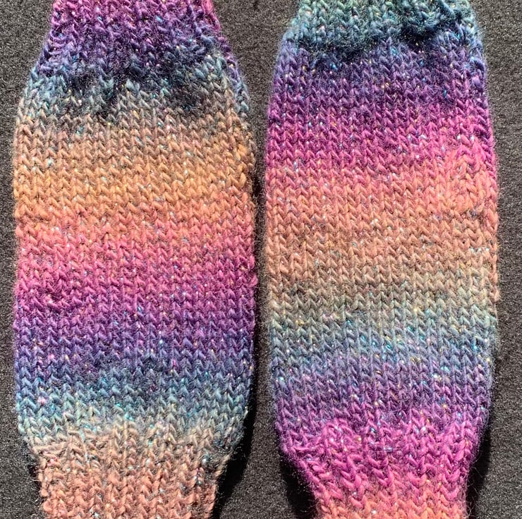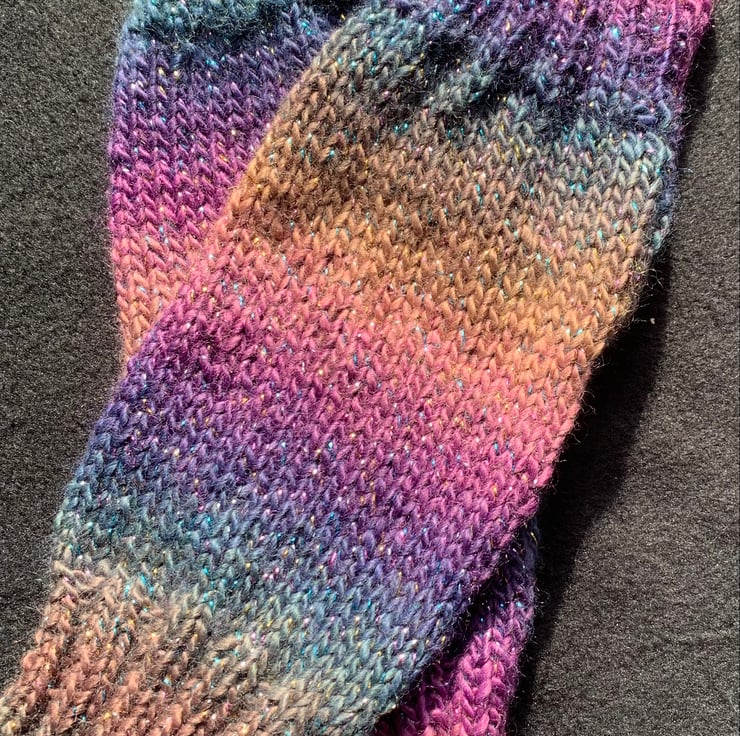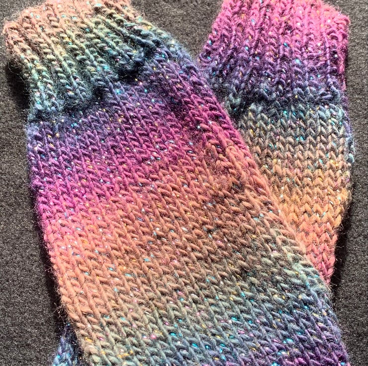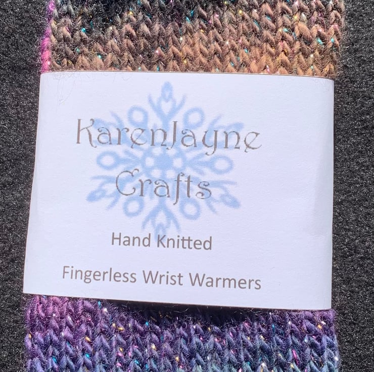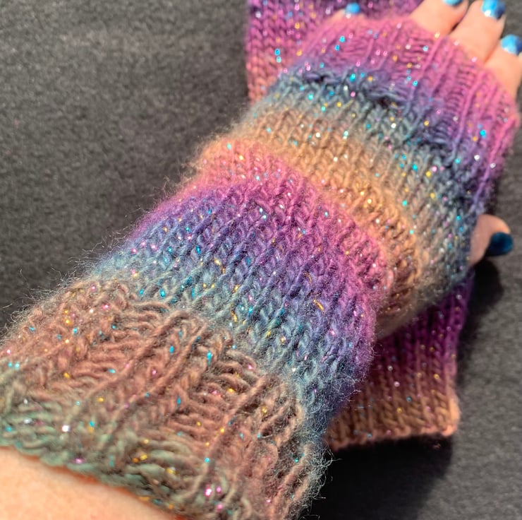 A pair of hand knitted fingerless wrist warmers. Knitted in Stylecraft Cabaret yarn these are a beautiful mix of ombre colours with a multicoloured sparkly thread running throughout. The sparkle catches the sunlight beautifully. They are lightweight and warm, ideal for autumn, winter or spring and will fit an average sized ladies hands.