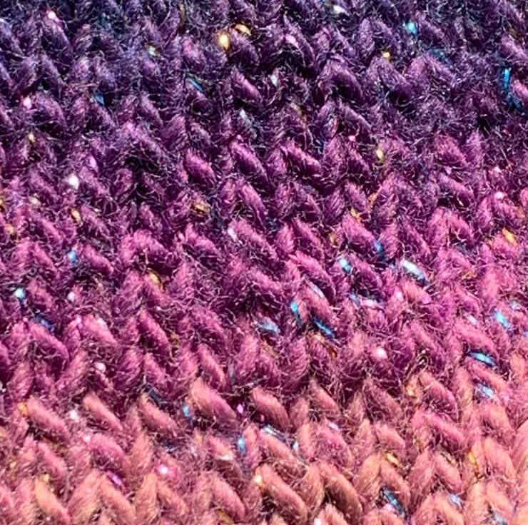 I love this yarn and the added bit of bling and colour palette it has. It’s lightweight and comfy. This colour reminds me of the colours of twilight.