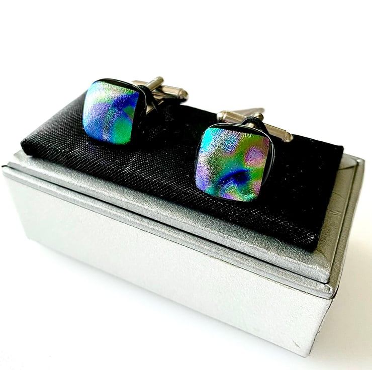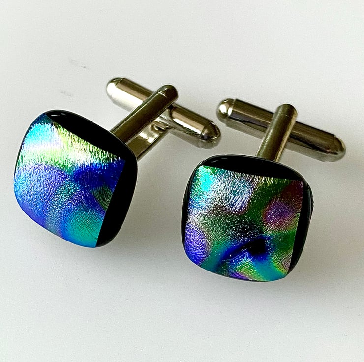These cufflinks are made from hand cut patterned dichroic glass layered on a black glass base. Fired at 800 degrees Celsius the layers form as one, which, when cooled were glued to silver plated cufflink bases. They shimmer in the light revealing beautiful shades of blues, greens, violet and pink.