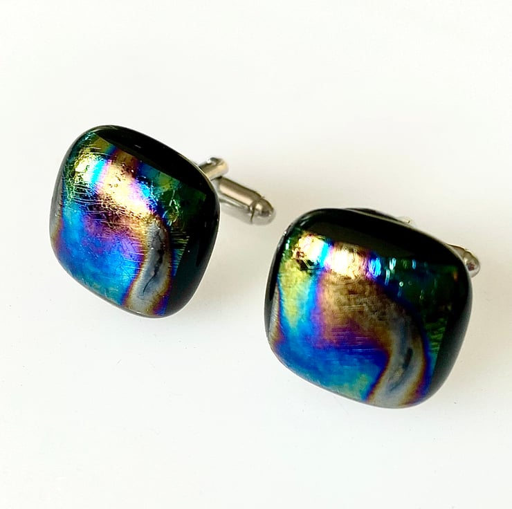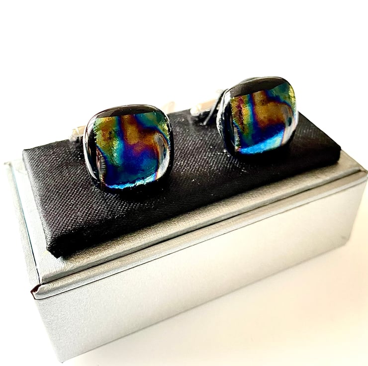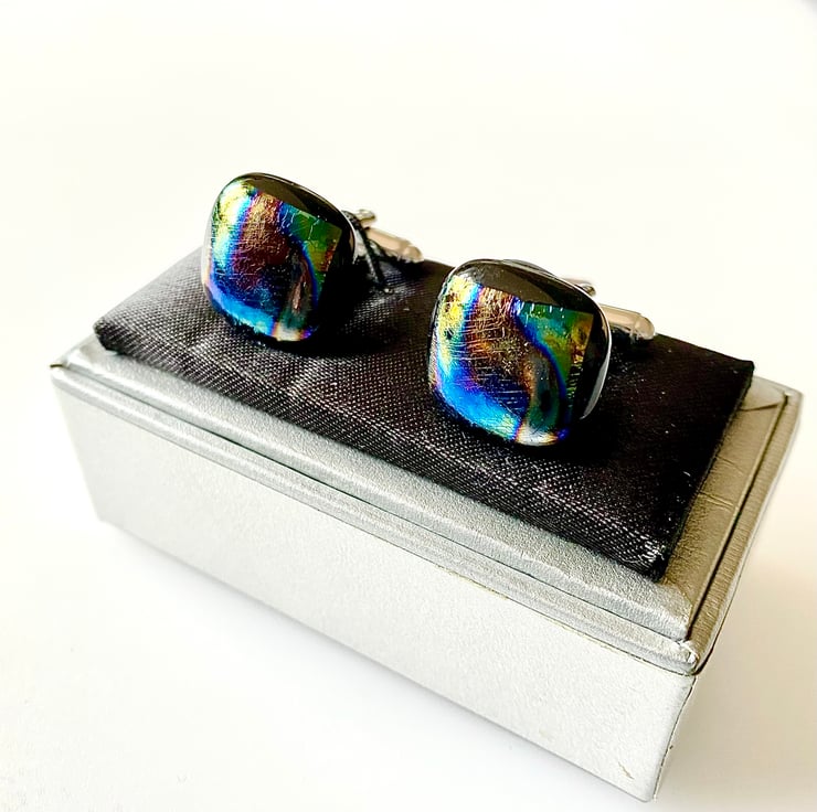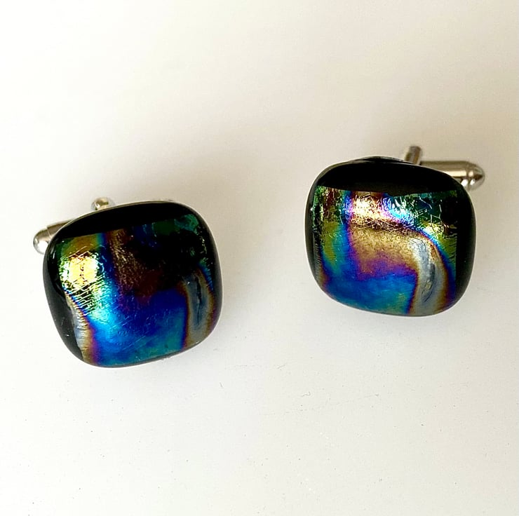 These cufflinks are made from hand cut patterned shimmering dichroic glass layered on a black glass base. Fired at 800 degrees Celsius the layers form as one, which, when cooled were glued to silver plated cufflink bases. The light changes their appearance from dark to an iridescent pattern of colour.