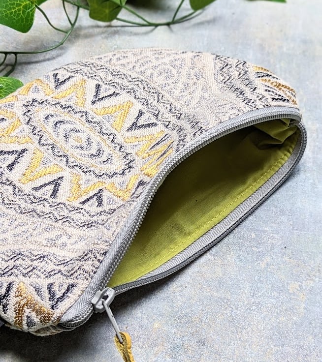 It is made from a grey, beige and yellow soft furnishing fabric with a polyester cotton lining. A light grey zip and yellow leather zip pull co-ordinate with the fabric of the purse.