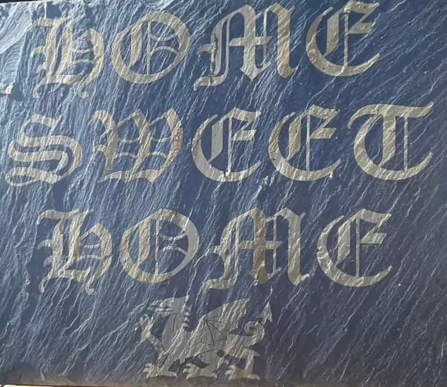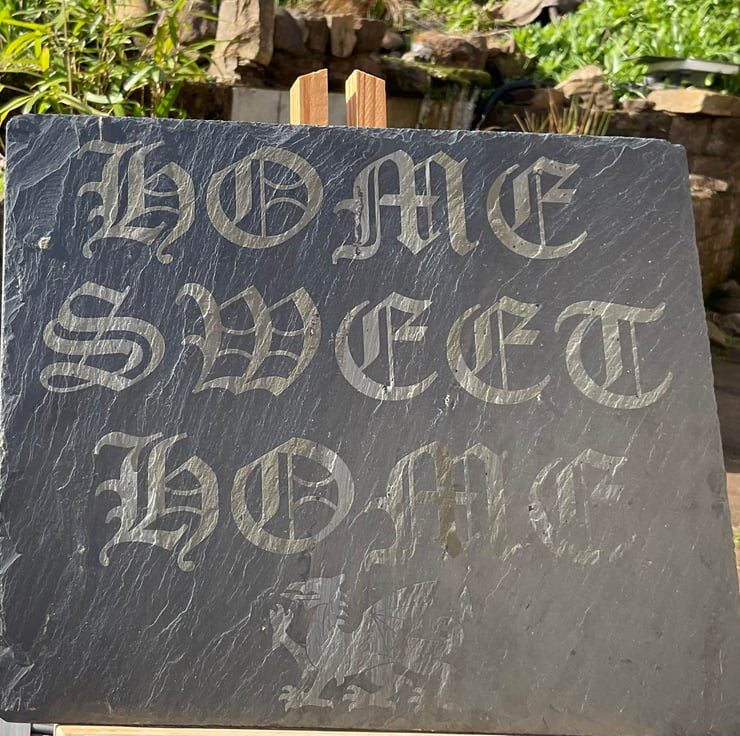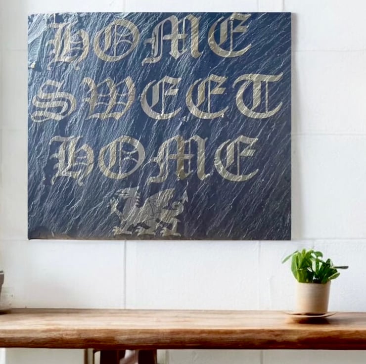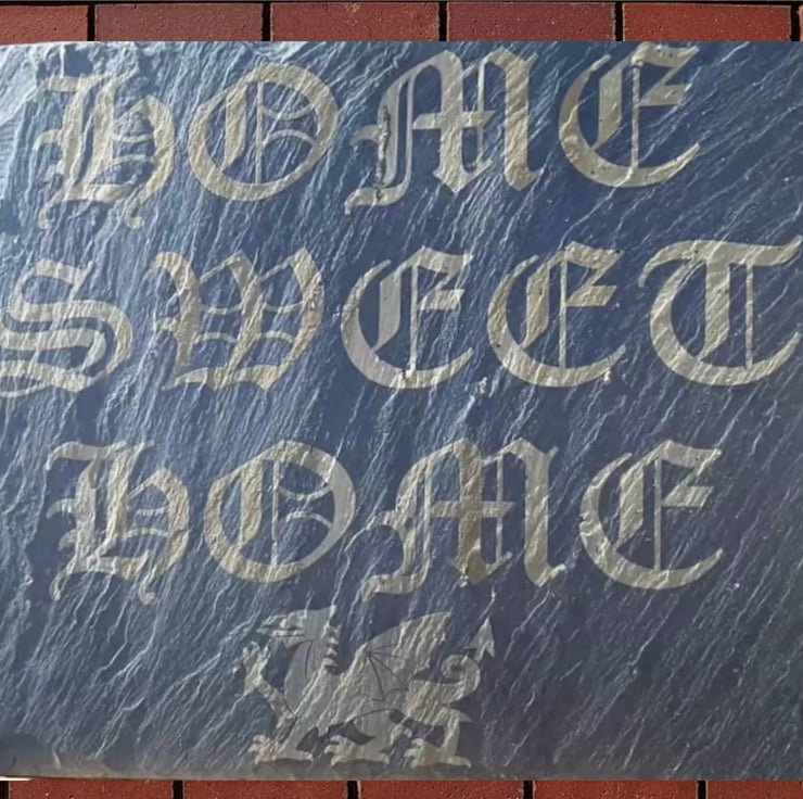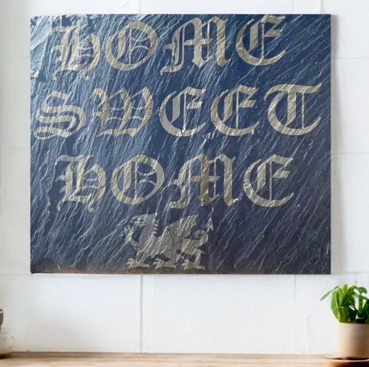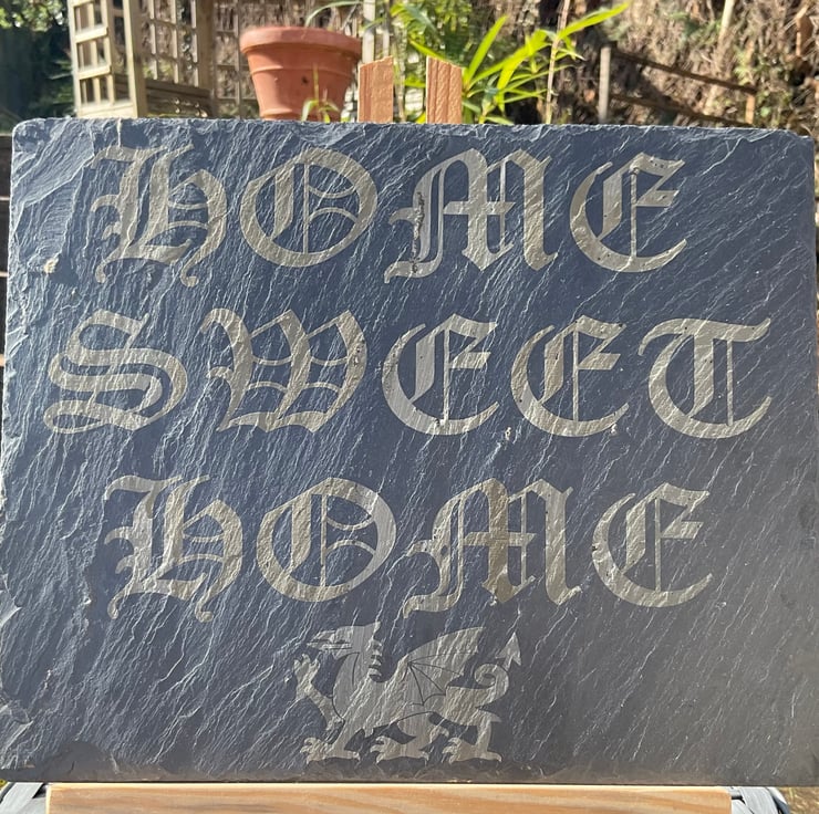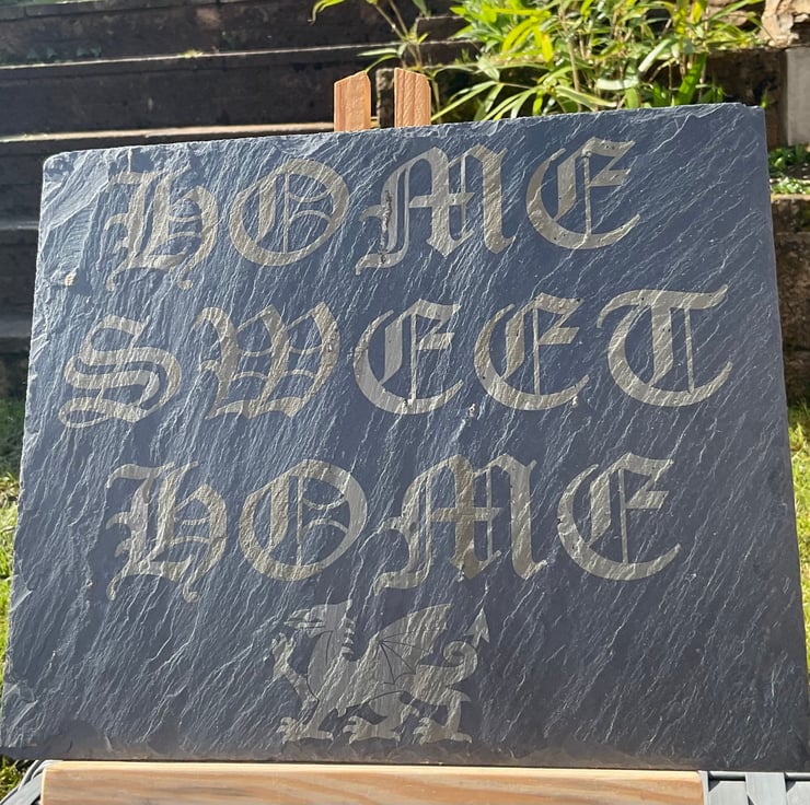 The slate has been engraved with the words Home Sweet Home and features a Welsh Dragon.