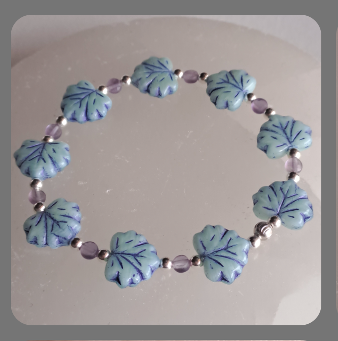 The leaf beads measure 1.2cm by 1cm, the Amethyst are micro-faceted coin beads and measure 4mm, and the sterling silver beads are 3mm with a moon cut 4mm bead. The bracelet is elasticated and measure about 6.5 inches. As the bracelet is elasticated, it is better to ease it on instead of pulling.