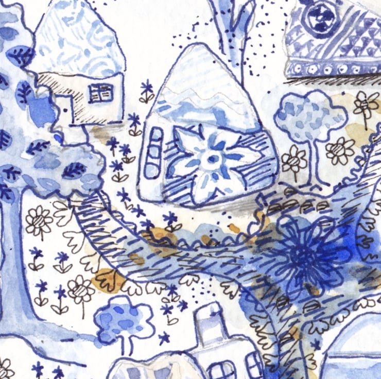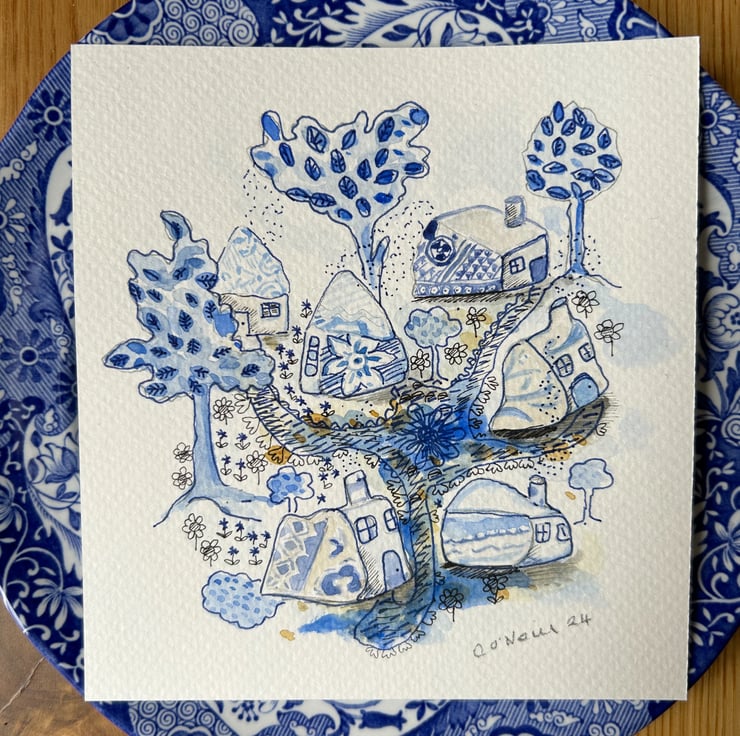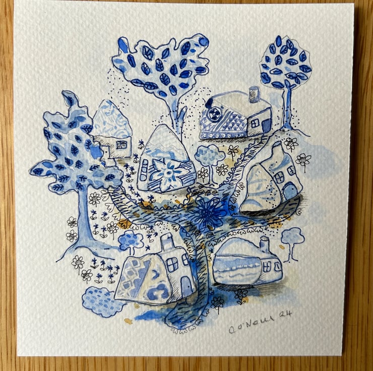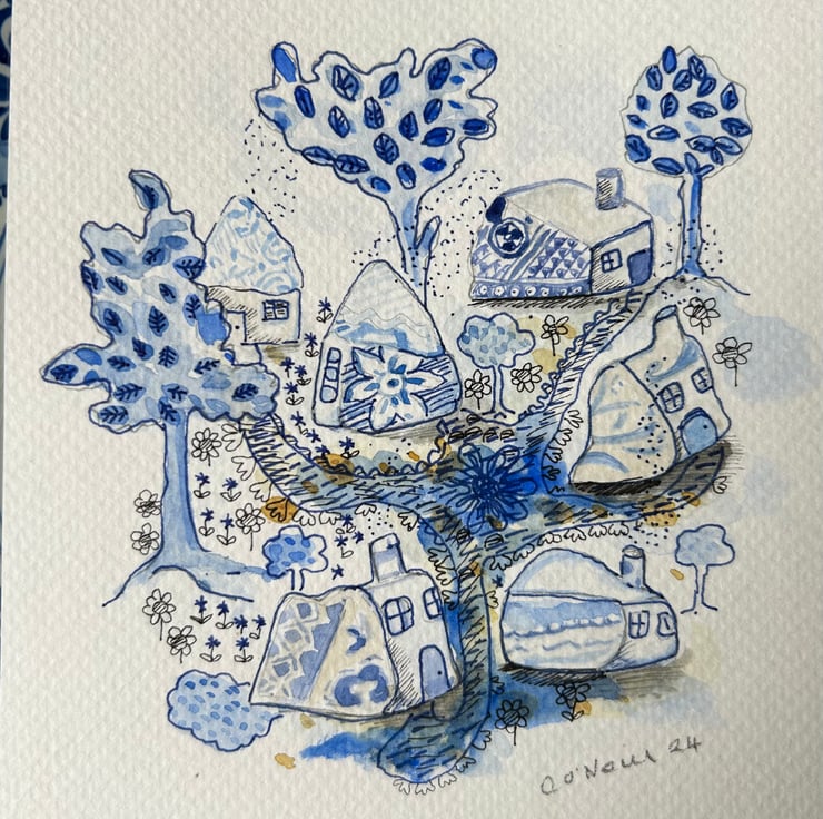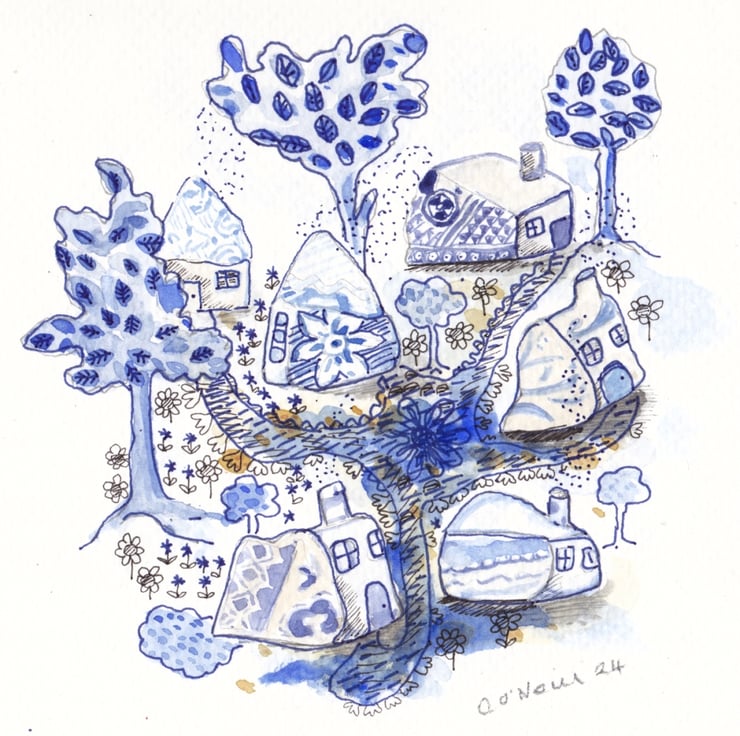 The inspiration for this artwork is the little pieces of pottery that my family and I collect whilst on holiday. It is one of my favorite pastimes looking for little bits of pottery and sea glass that as been washed up. The little houses are illustrated with little bits of pottery that I have found whilst on holiday.