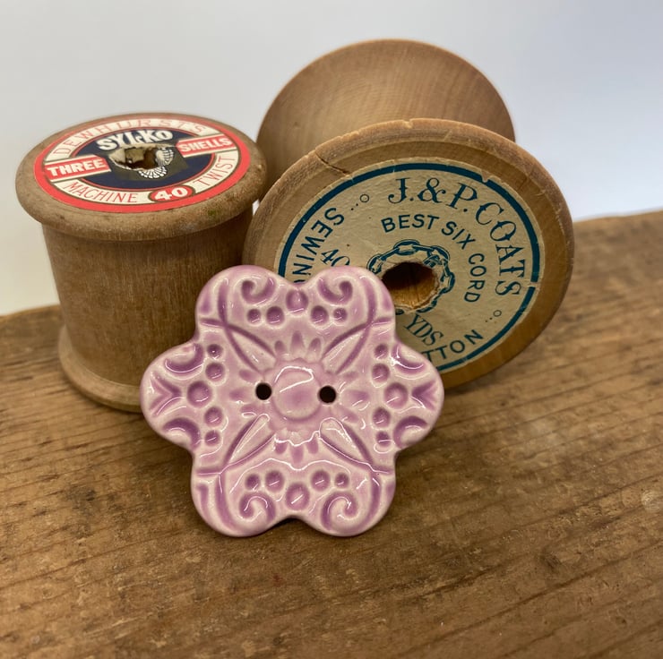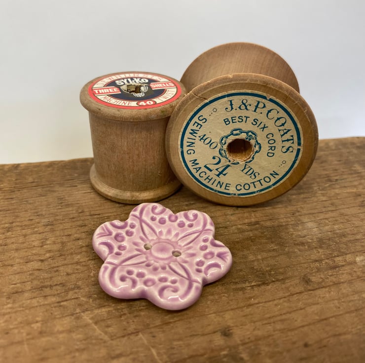 This large pottery button is made from white earthenware clay, embossed and glazed on the front. It is then fired to 1100 degrees, so nice and strong. Slightly concave. It measures 4cm x 3.5cm.They can be handwashed or machine washed on a low temperature. Perfect for all sorts of arts and craft projects.
