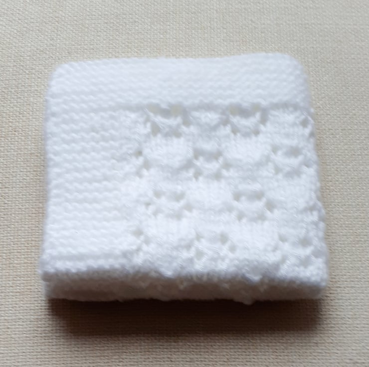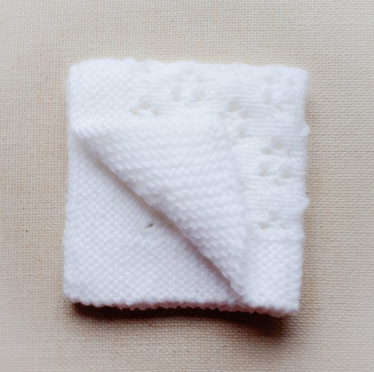This hand knit PATTERN is for a blanket for a doll Blanket Size: Width: 26 cm or 10.5 inches and Length: 32 cm or 12.75 inches. The blanket is knitted in 4 ply yarn, used double throughout, and a pair of 4 mm knitting needles.