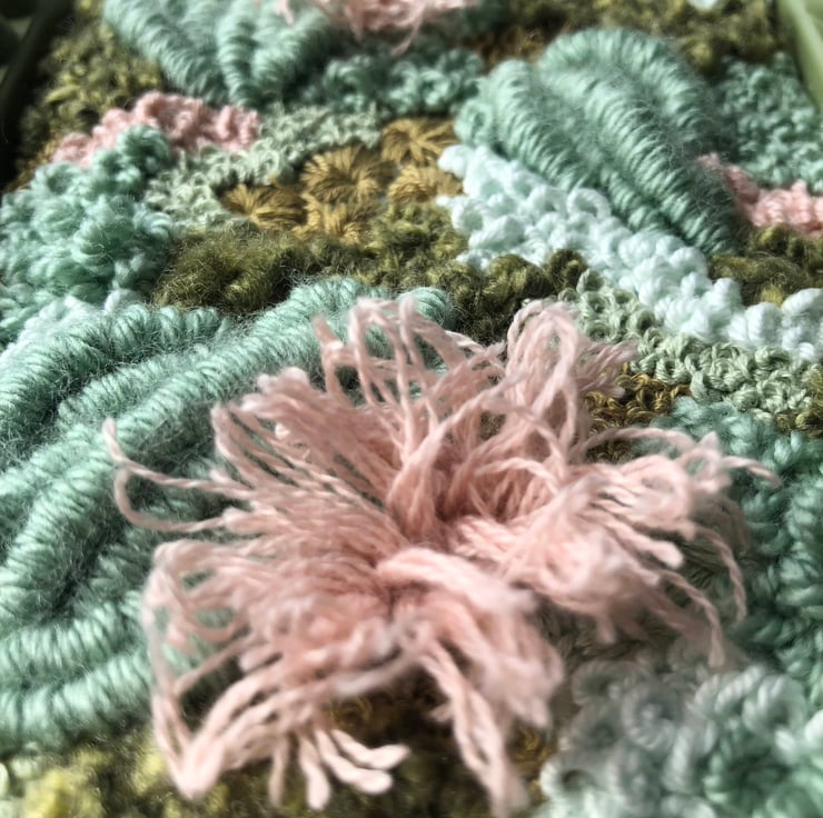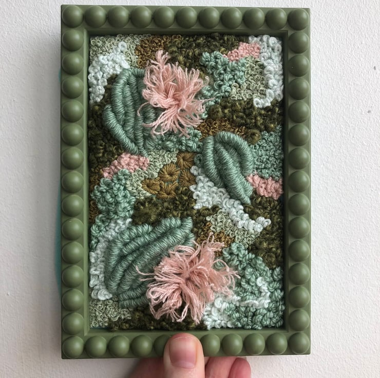 Ilkley moor a 6 x 4 inch frame containing a one of a kind piece of embroidery art. Embroidery thread and yarn have been hand sewn onto a green fabric in an abstract pattern and then placed in a green frame. Creating a piece of art which is both eye catching and unique