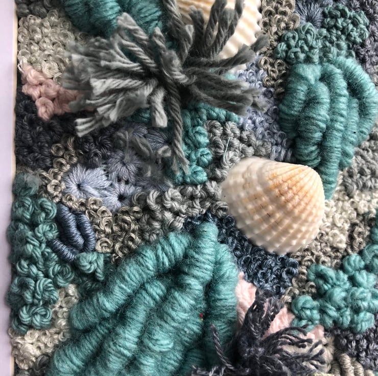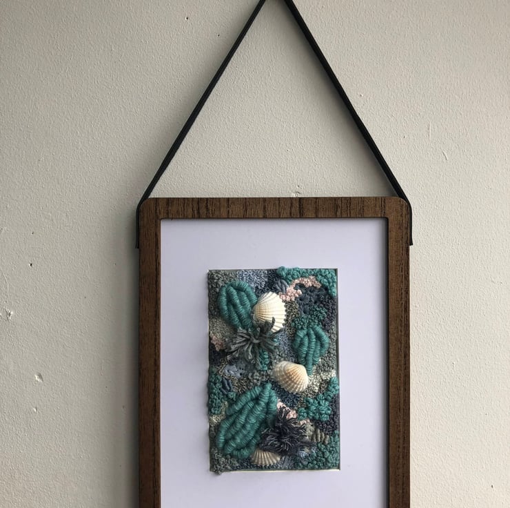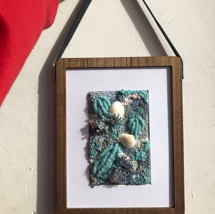 Sea view a 10x15 cm piece of hand embroidered art placed in a 17x22 cm frame. Embroidery thread, yarn and shells have been hand embroidered in an abstract pattern creating a piece of art which is so eye catching and unique