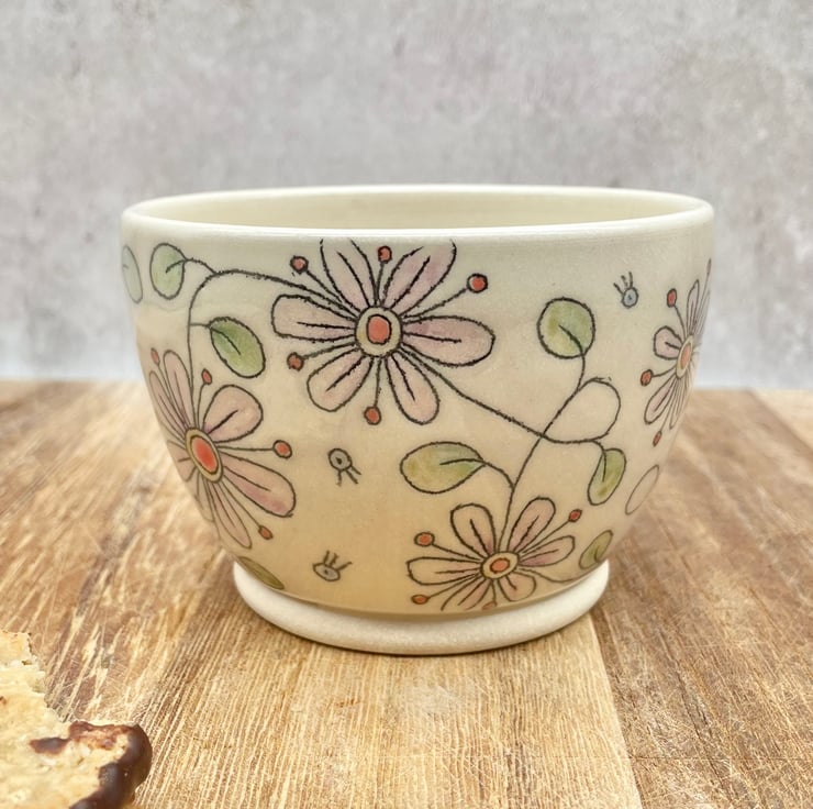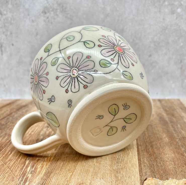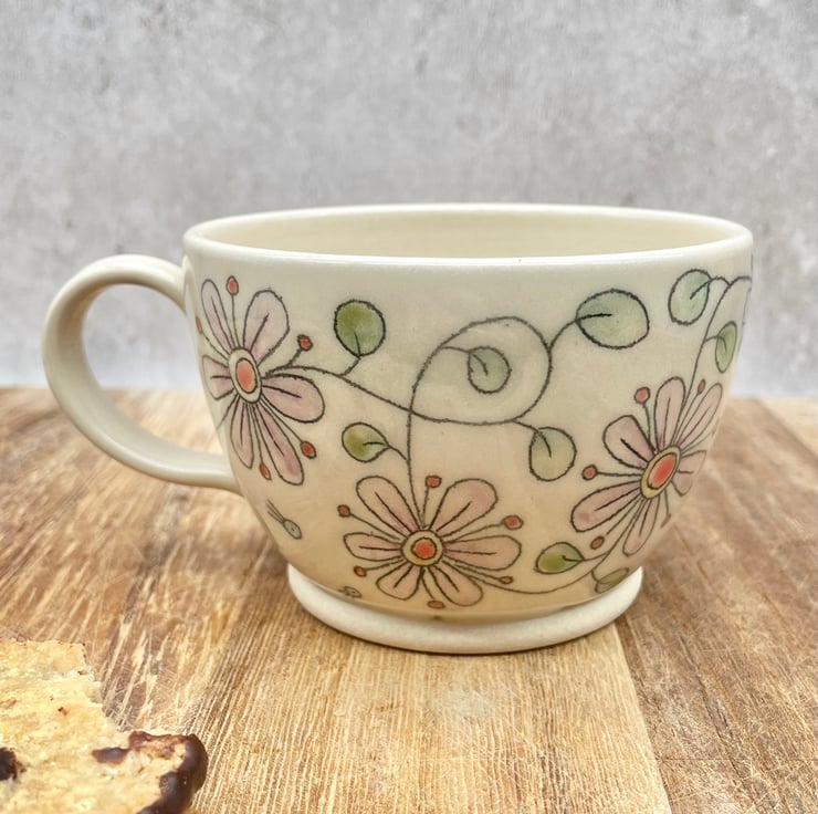 Thrown on the wheel, this pretty stoneware mug incorporates a pattern of twirly abstract flower stems and seed heads in happy pastel shades of red, lilac, green and a touch of blue.