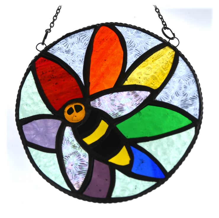 This is a stained glass suncatcher made using the Tiffany copper foil technique.