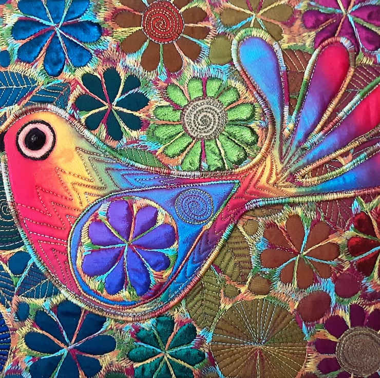 Fantasy Bird Textile Art canvas with Free Machine Embroidery