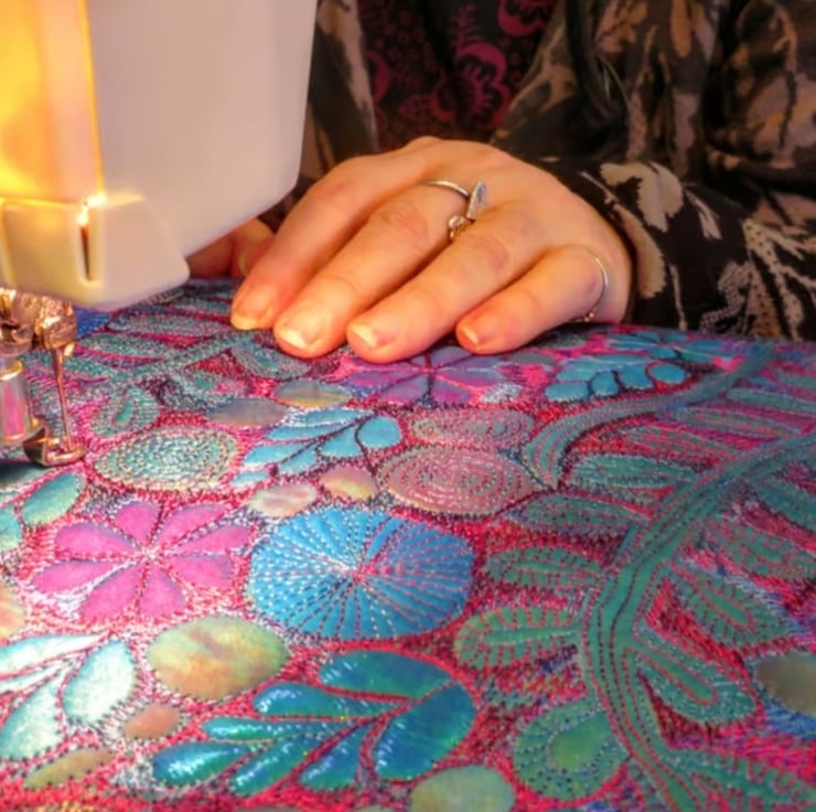 This is an artwork with hand dyed Egyptian cotton and silks, appliqué and free motion embroidery.