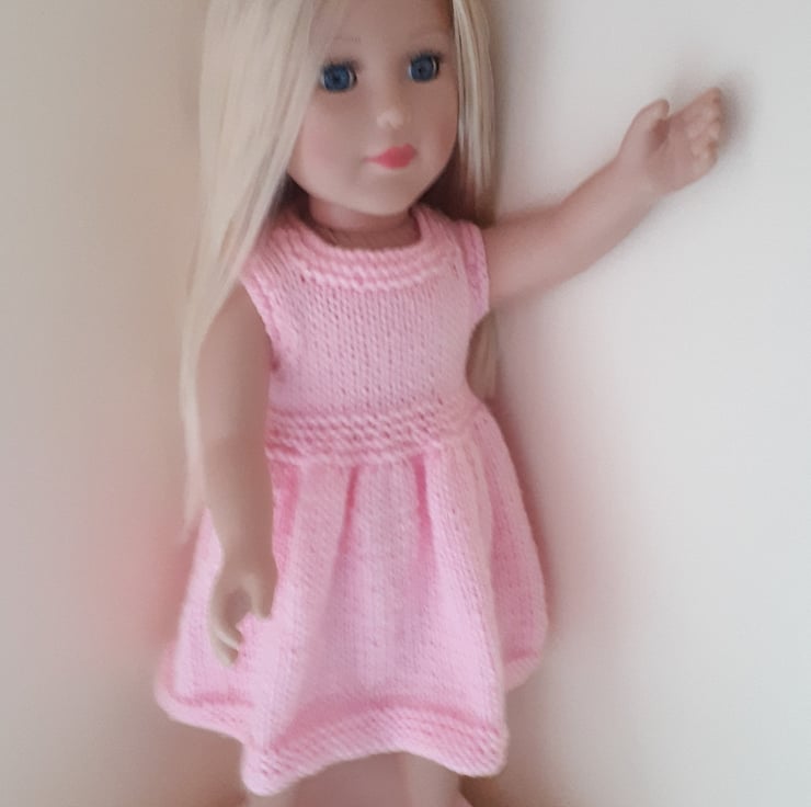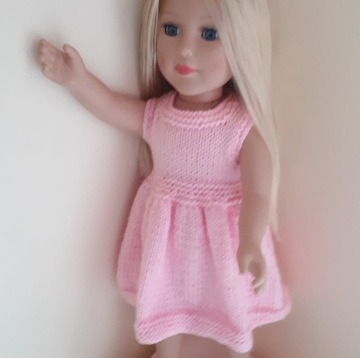 This hand knit PATTERN is for a dress for a Doll. To fit Doll Height 46 cm or 18 inches. Dress is knitted in double knitting yarn using 3.25 mm and 4 mm knitting needles and is knit flat and seamed.