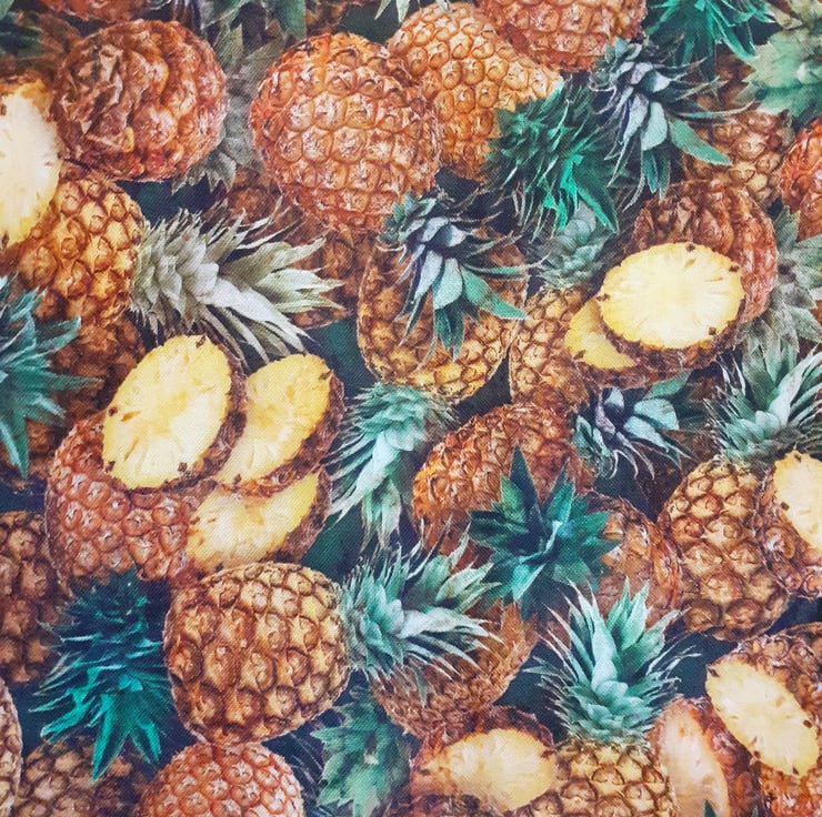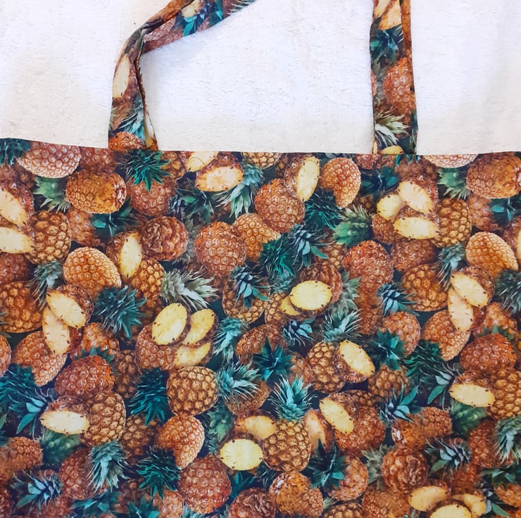Tossed Pineapples cloth shopping bag, some whole some in slices, all over design. very comfortable to carry with cloth shoulder straps, ideal for carrying shopping or craftwork in .