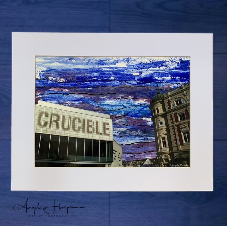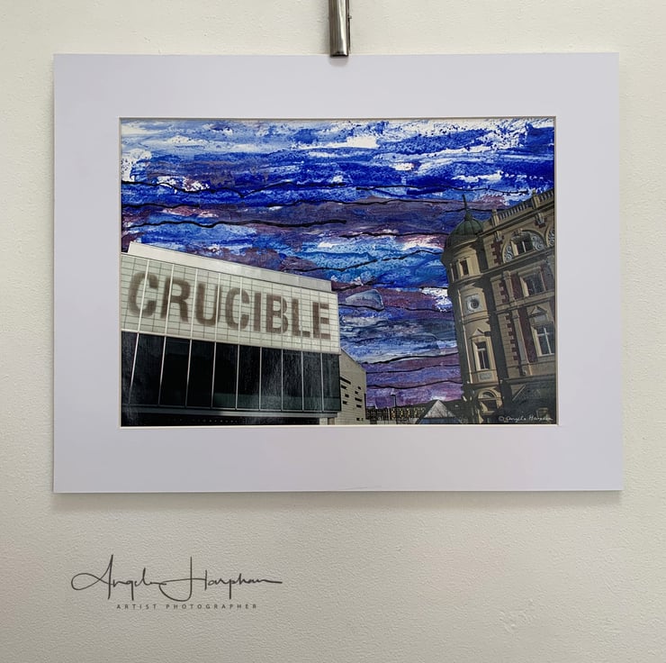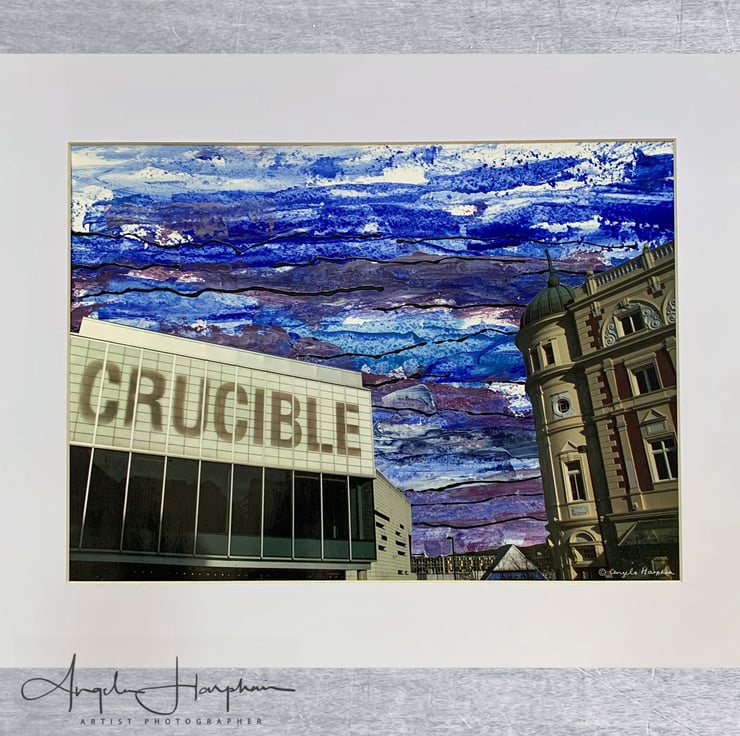 Enjoy experimenting and combining photography with other mediums. This is a combination of two of the theatres in Sheffield. A montage, one of my photograph added to an acrylic painting to give the drama of dusk on a summer visit to the theatre.