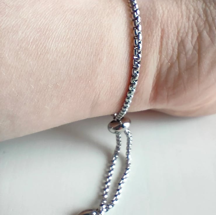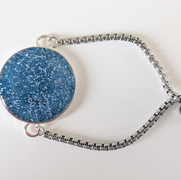 This bracelet fits wrists up to 8.5 inches. It features a light blue sparkly resin cabouchon set within a silver coloured bezel.