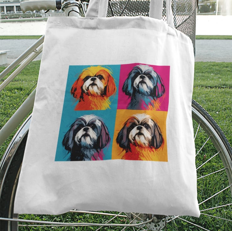 Add a splash of colour and personality to your daily outings with this eye-catching tote bag featuring a Shih Tzu in vibrant pop art style.