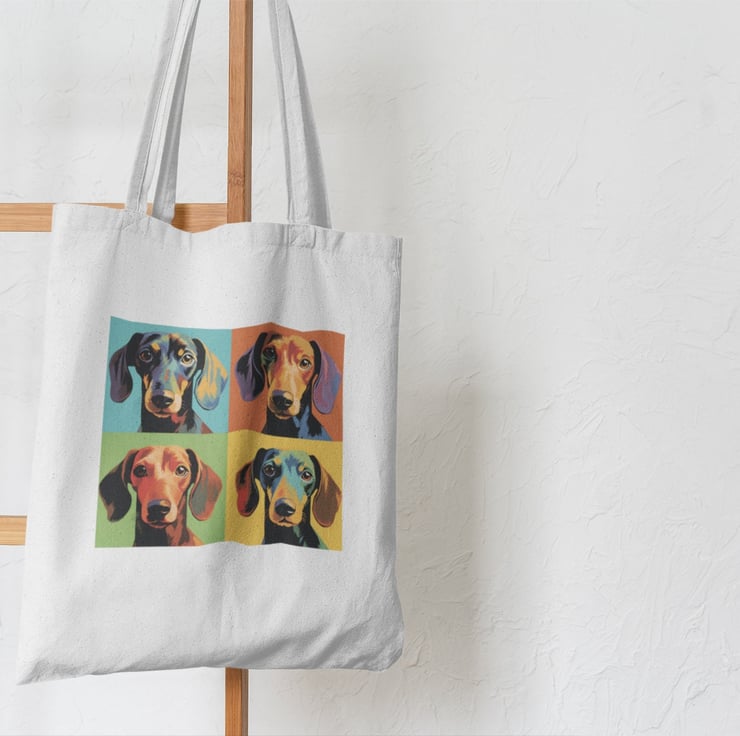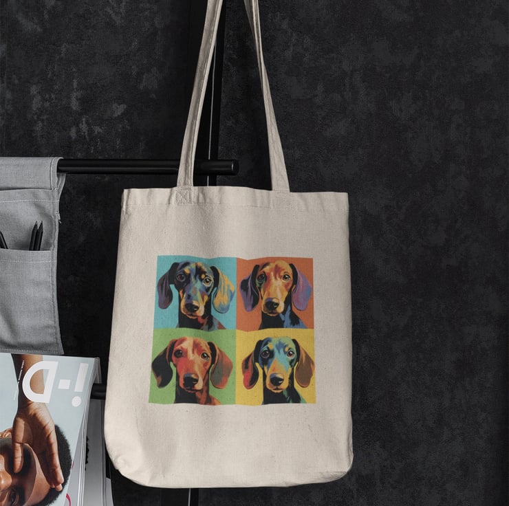 Add a splash of colour and personality to your daily outings with this eye-catching tote bag featuring a Dachshund in vibrant pop art style.