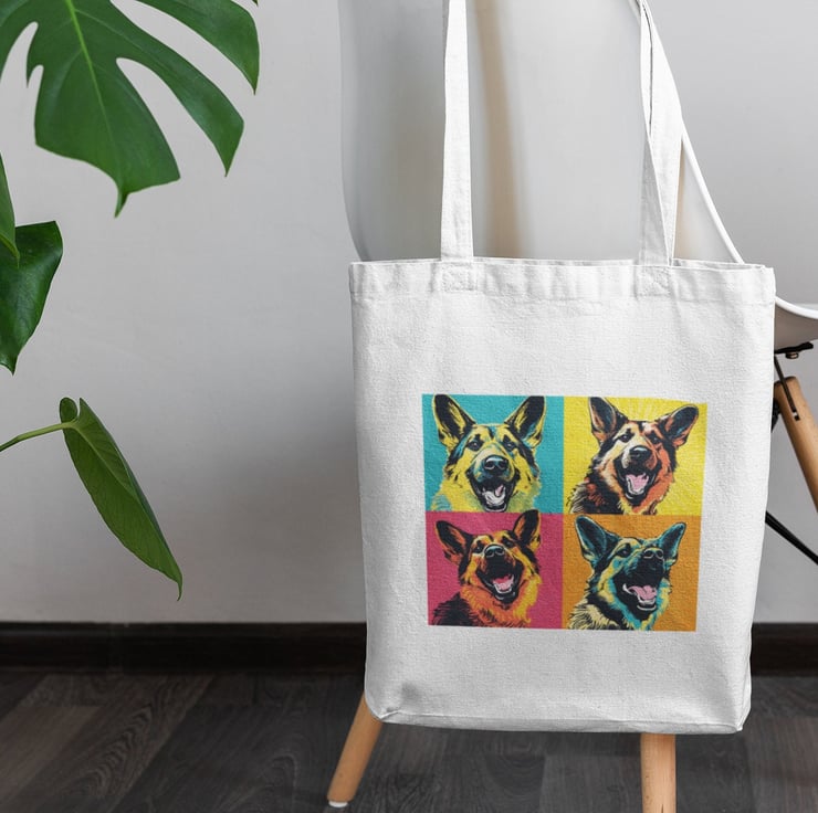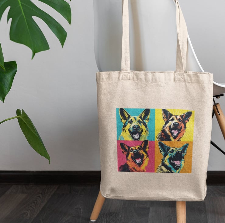 Add a splash of colour and personality to your daily outings with this eye-catching tote bag featuring a German Shepherd in vibrant pop art style.
