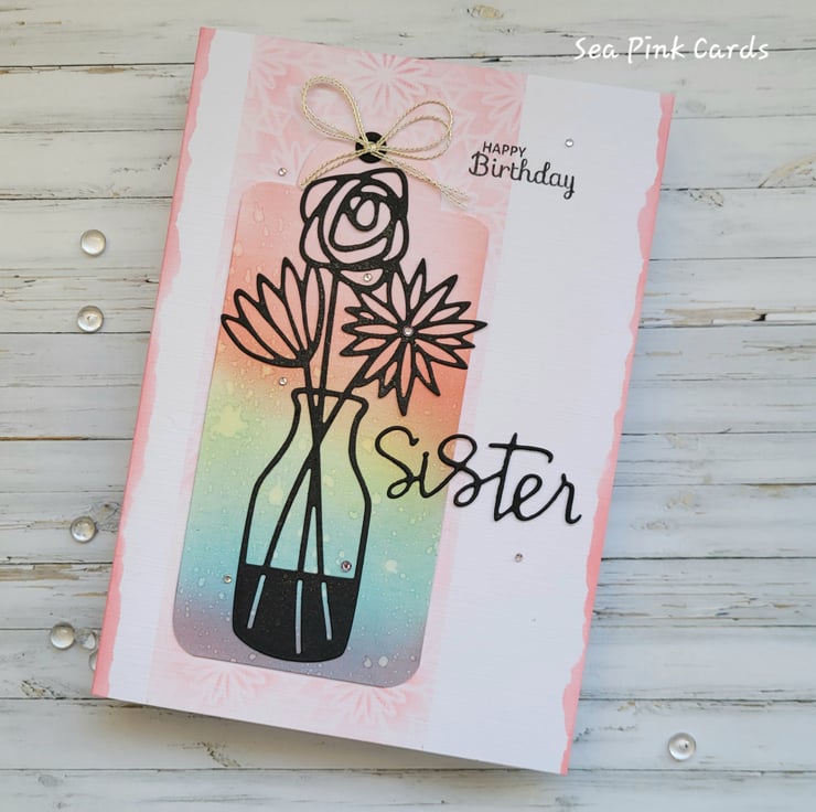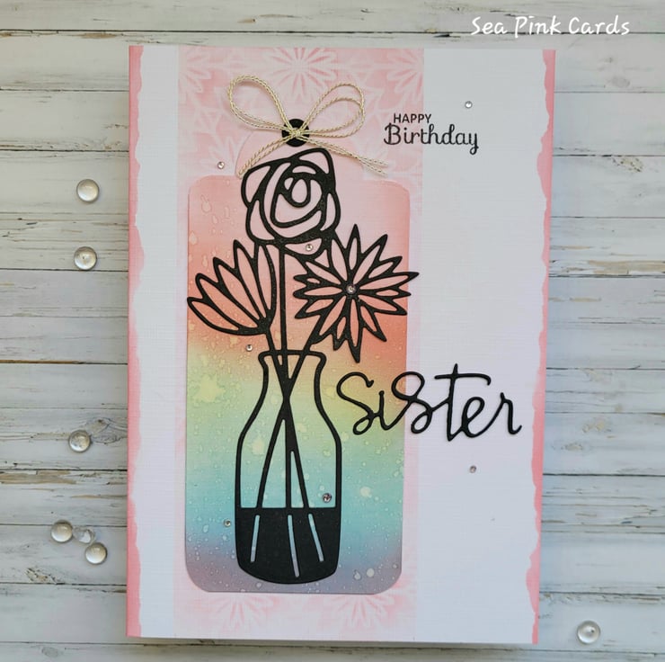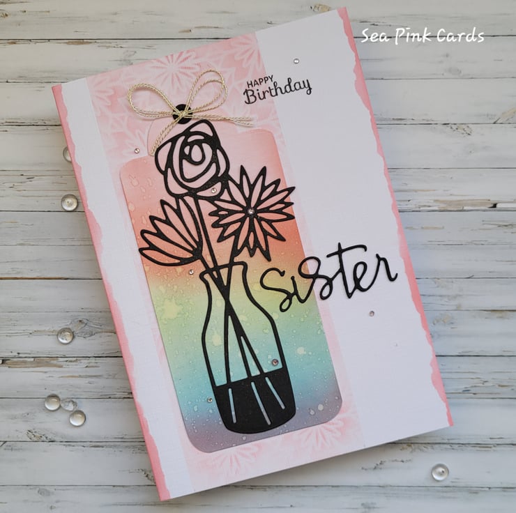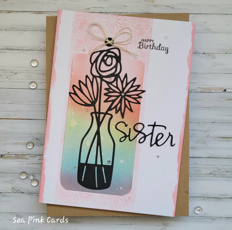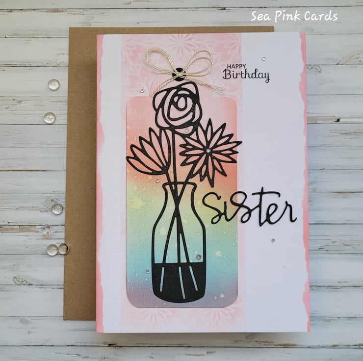 A one-of-a-kind Sister birthday card, that has been individually designed and handcrafted. There is a die cut black outline vase with blooms, set against a pastel rainbow of colour. The inside is blank white for your own message. Lots of lovely texture and detail, the card measures 12.5 x 17.5 cms and comes supplied with a 100% recycled brown kraft paper envelope.