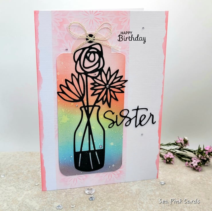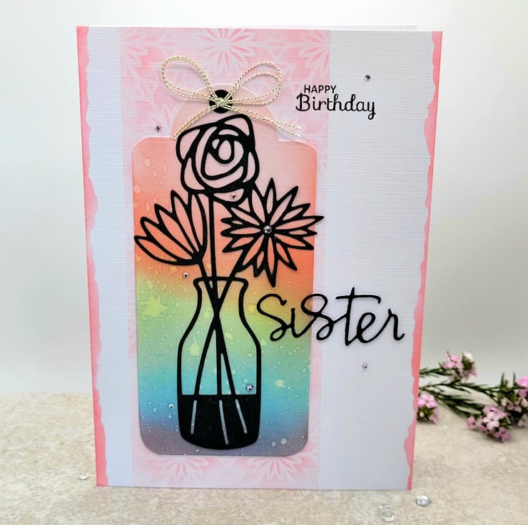 Happy Birthday Sister. That is the sentiment of this one-of-a-kind birthday card, that has been individually designed and created in my craftroom. There is a die cut black vase with three blooms, set against a pastel rainbow of colour. The inside is blank white for your own message. Lots of lovely texture and detail, the card measures 12.5 x 17.5 cms and comes supplied with a 100% recycled brown paper envelope.
