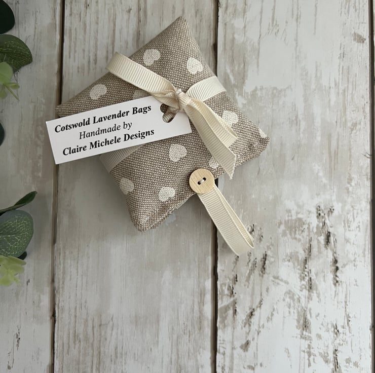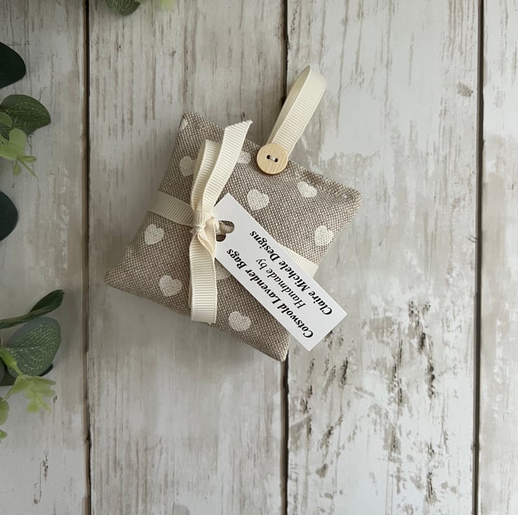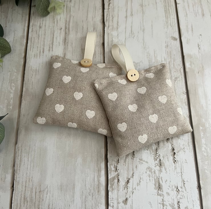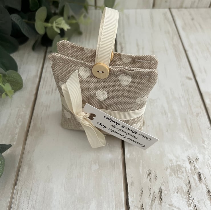 The sachets have been finished in a lovely beige with cream hearts fabric design and finished with a cream grosgrain hanging ribbon and wooden button at the top. Pattern placement may vary on each sachet, but I try to ensure there is a good pattern to both sides.