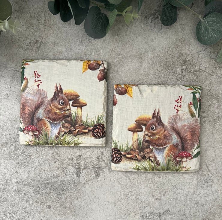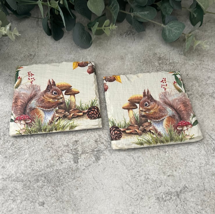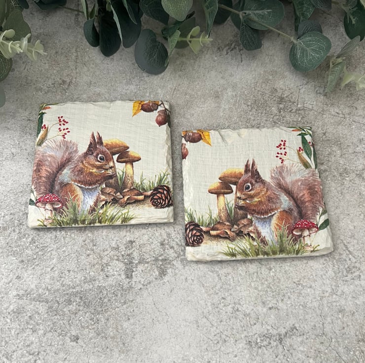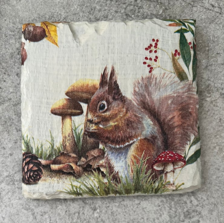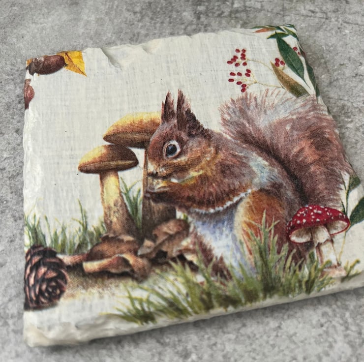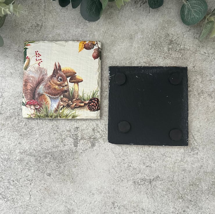 The slate coasters have been painted to one side and decoupaged with a lovely rustic red squirrel design and finished with many coats of heat and water resistant varnish for protection. The reverse of each coaster has 4 rubber feet to protect your furniture.