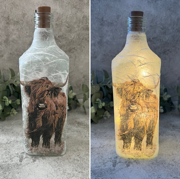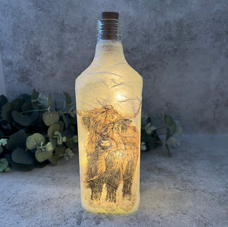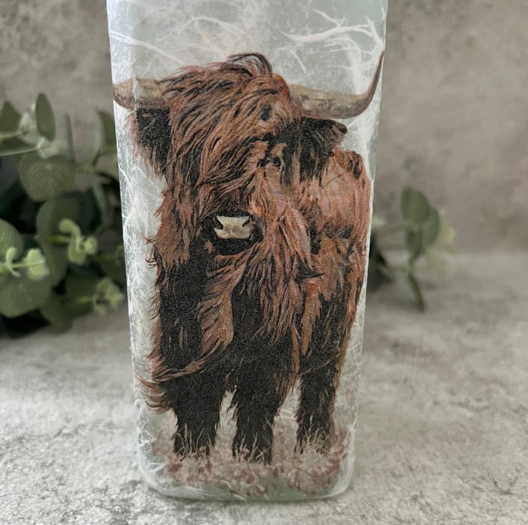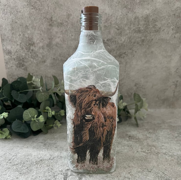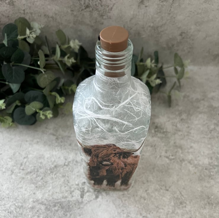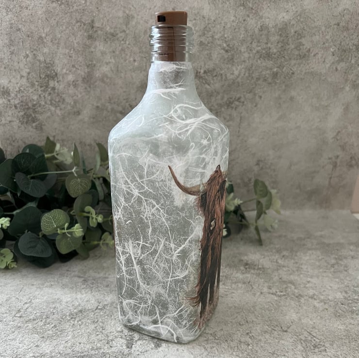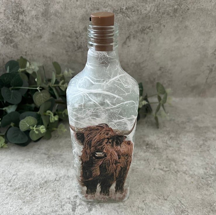 The bottle has been decorated using a textured technique and decoupaged with a lovely highland cow design to both sides. The bottle has been finished with several coats of heat and water resistant varnish for protection.