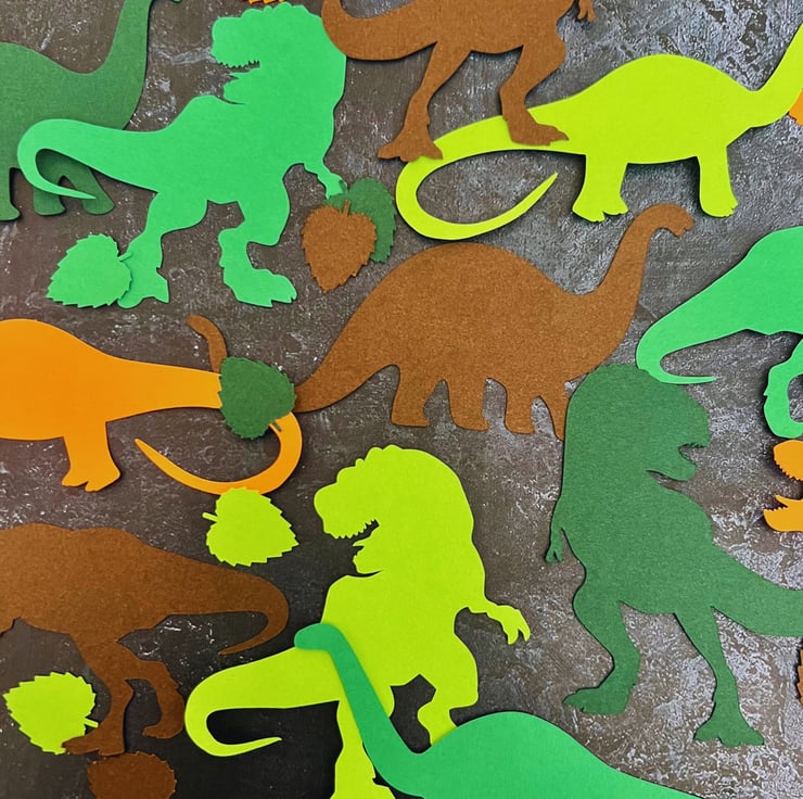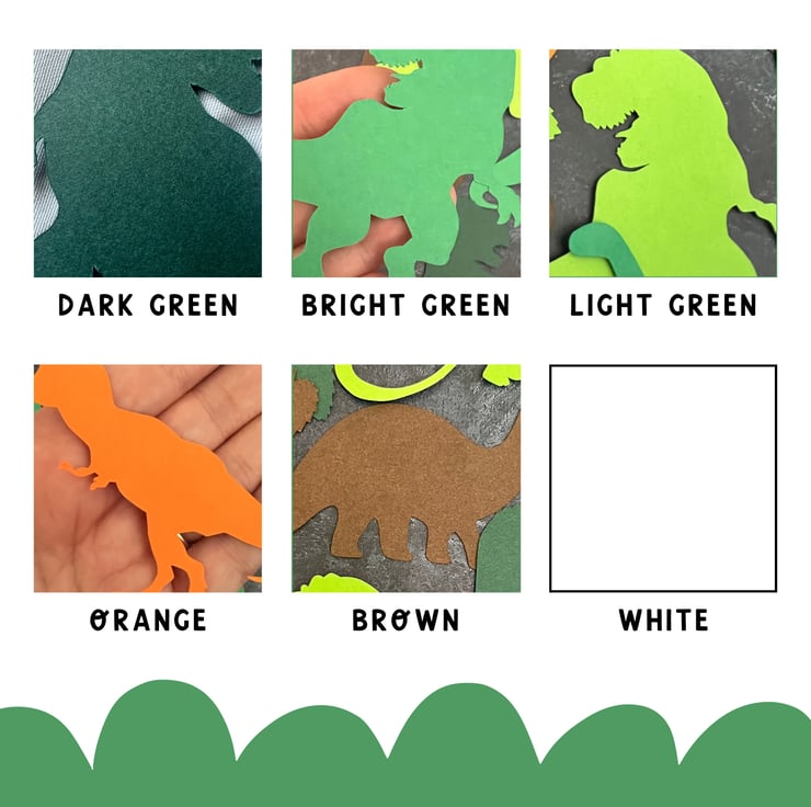 This option includes a diverse assortment of 12 dinosaurs and 12 leaves in a charming mix of greens, browns, and orange hues. These pre-cut shapes are conveniently prepared and ready to be shipped, saving you time and effort.