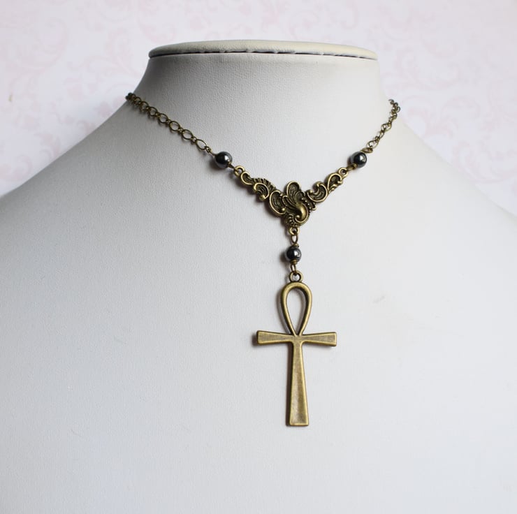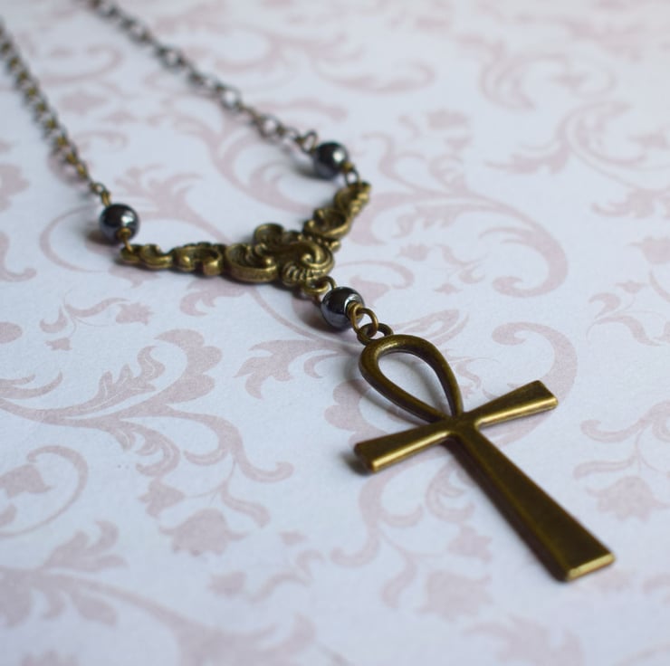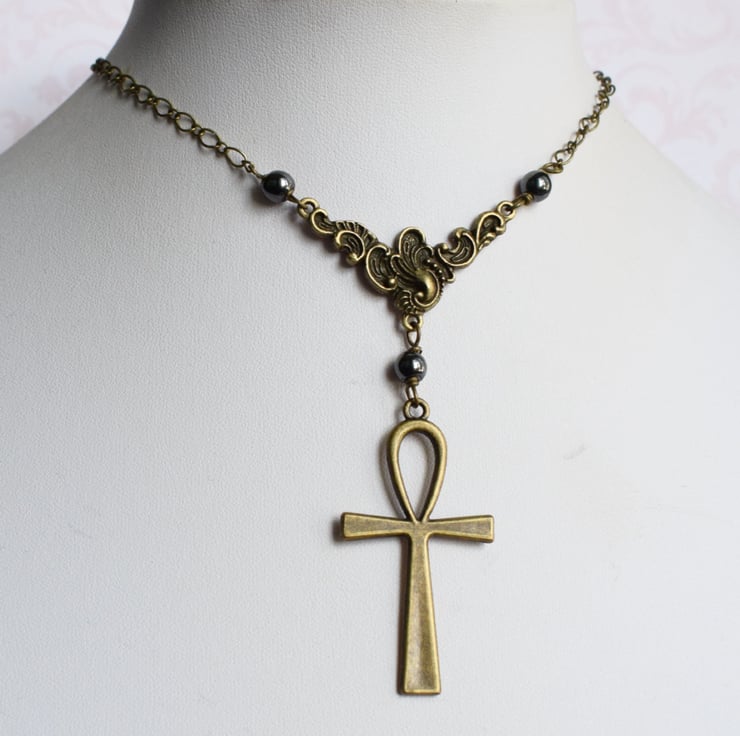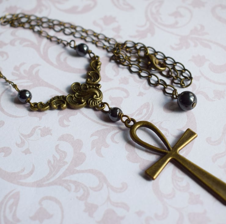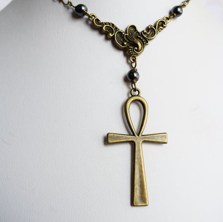 The ankh pendant is 2 inches high but with the bead and the shape of the elaborate connector piece it hangs almost 4 inches from the necklace making a real statement pendant. There is another hematite bead either side of the connector and then the necklace is made with bronze chain. It has an extender chain so it can be worn from just under 15 inches to 18 inches long and the extender chain is finished with a larger hematite bead.