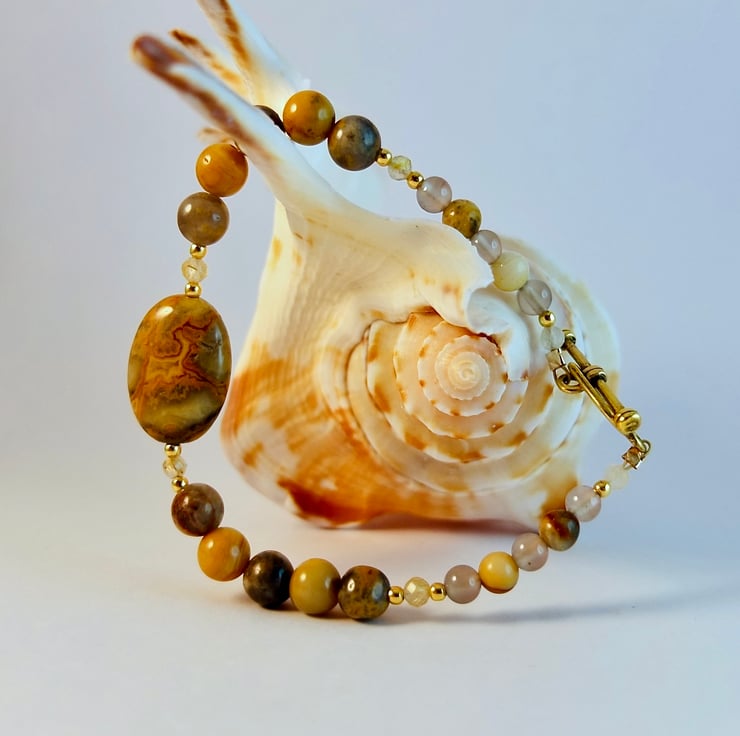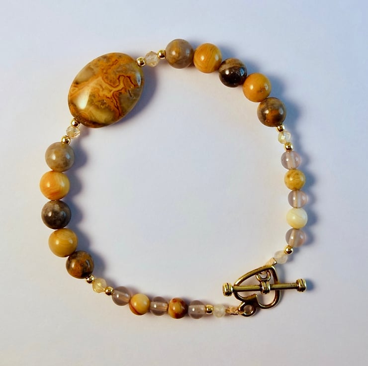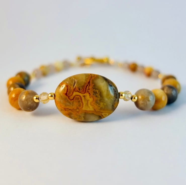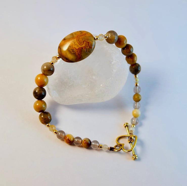 The centrepiece for this striking bracelet is a 15x18mm Crazy Lace Agate oval bead with extraordinary swirling patterns of red-brown and mustard yellow over a background of cream and grey.