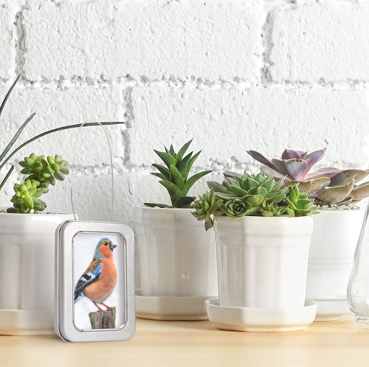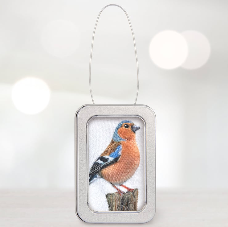 This is a little 3D fabric Chaffinch, framed in a sturdy recyclable aluminium tin, with a wire hanger.
