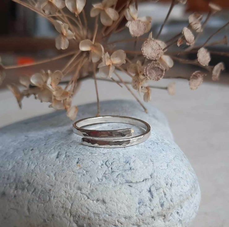 The ring is adjustable up or down a size because of its open, crossover style – just choose your preferred size from the drop down menu (see photos for a size chart).