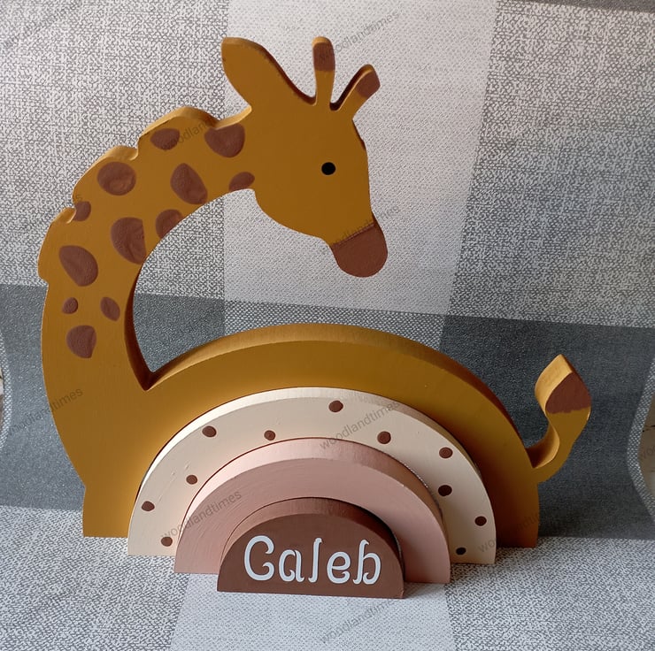 Giraffe rainbow stacker for zoo themed nursery, personalised boys bedroom shelf