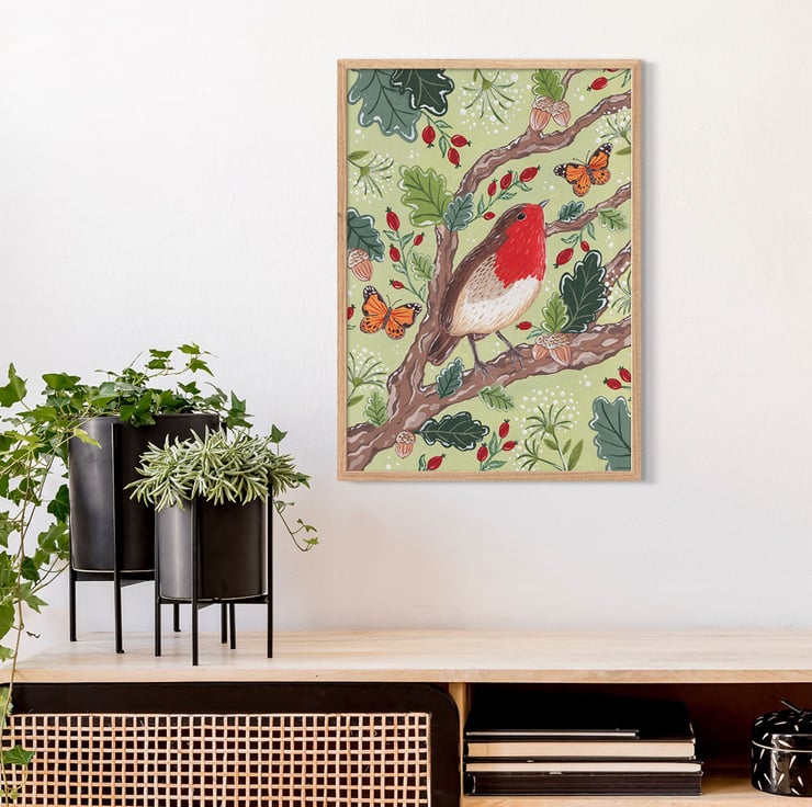 Perhaps the most iconic of British birds, the robin in this illustration is captured in a fresh way, contrasting his famous red breast with a leafy green background. Ideal for adding a pop of colour to your home.