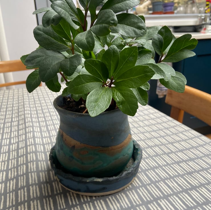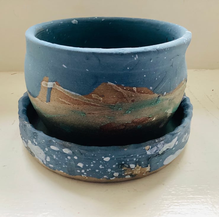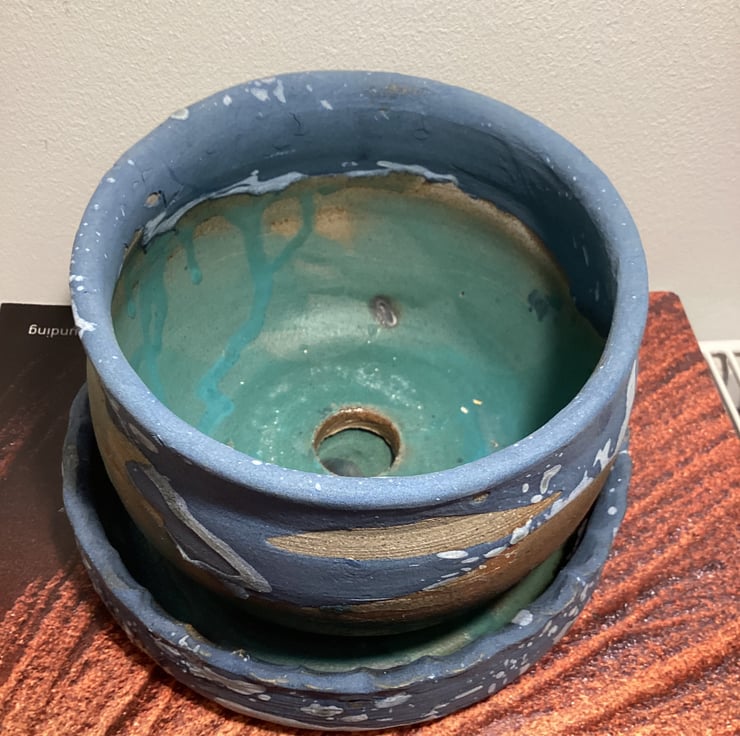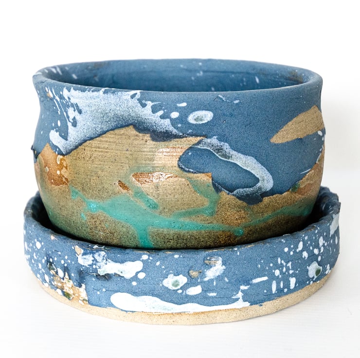 Hand-thrown pottery planter and water tray in rich blues, turquoise and sand colours, evocative of the sea. The pot measures 17cm circumference and 11cm high and the tray 18cm. Glazed stoneware so ok for the garden as well as indoors, although I wouldn’t leave it out over winter.