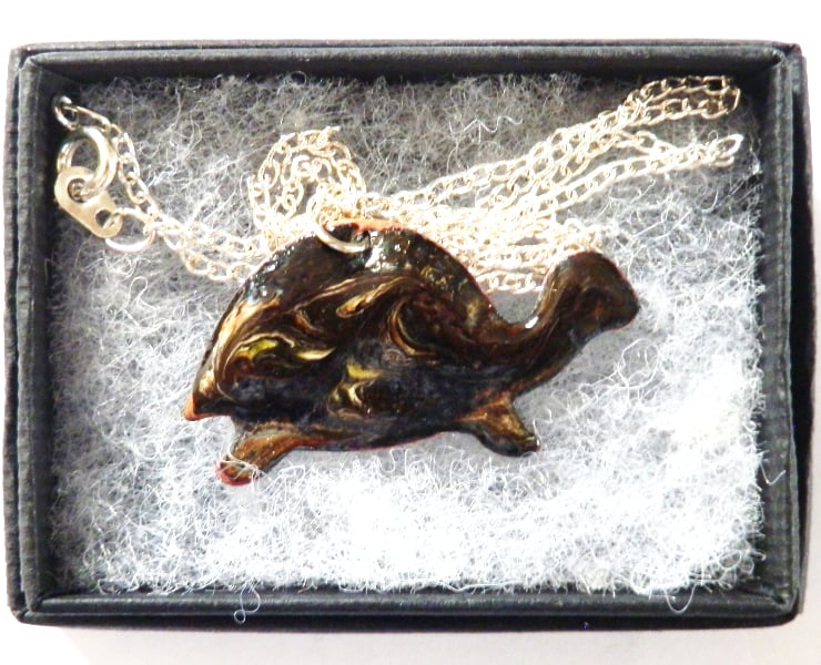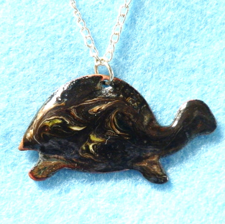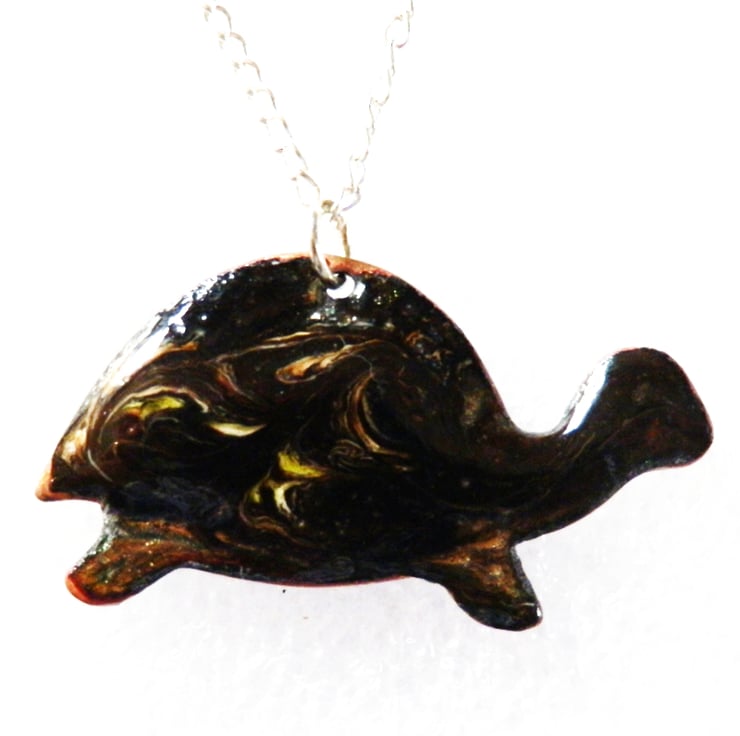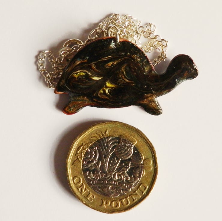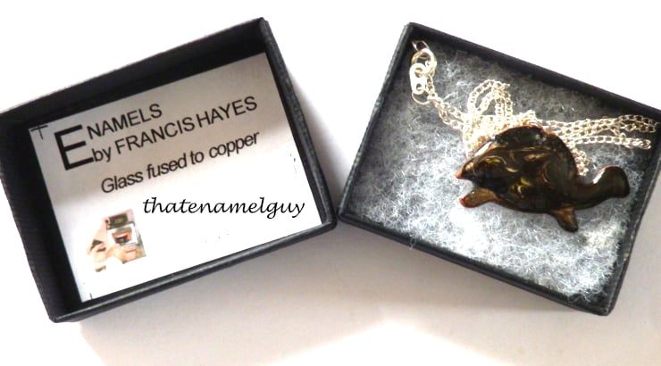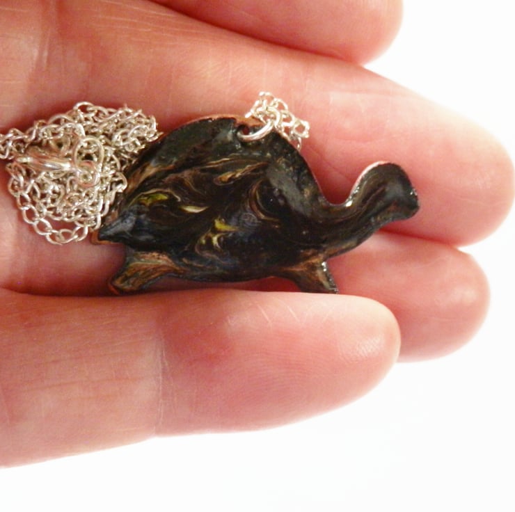 I have made this pendant by building up layers of glass enamel over the copper tortoise shape. I need several layers of a base coat, in this case clear enamel, over which I can then apply coloured layers. In this case the coloured layer is black. While the black coat was melting, in the kiln, I used a steel point to disturb the surface, exposing the clear enamel and bringing the copper base into view to show the patterning of a tortoise's shell,