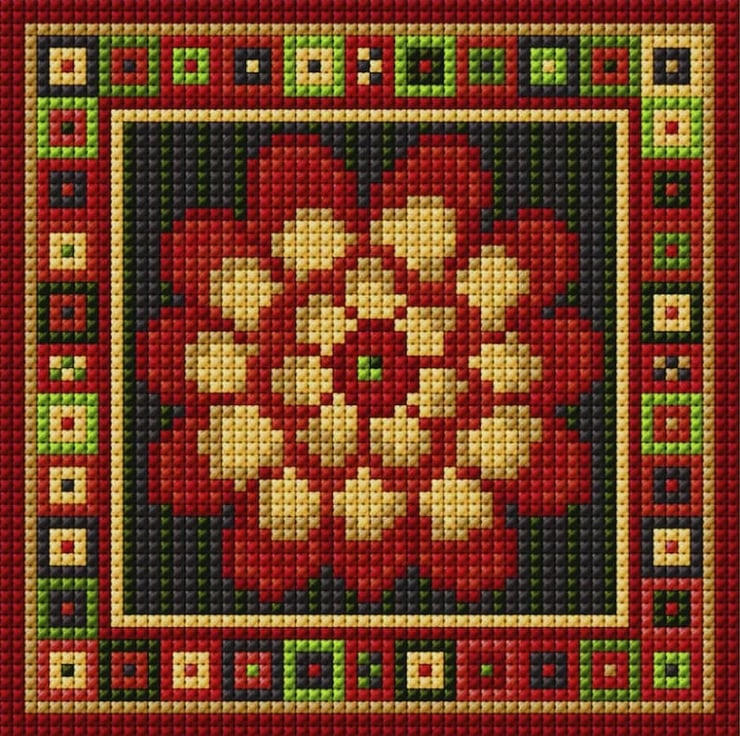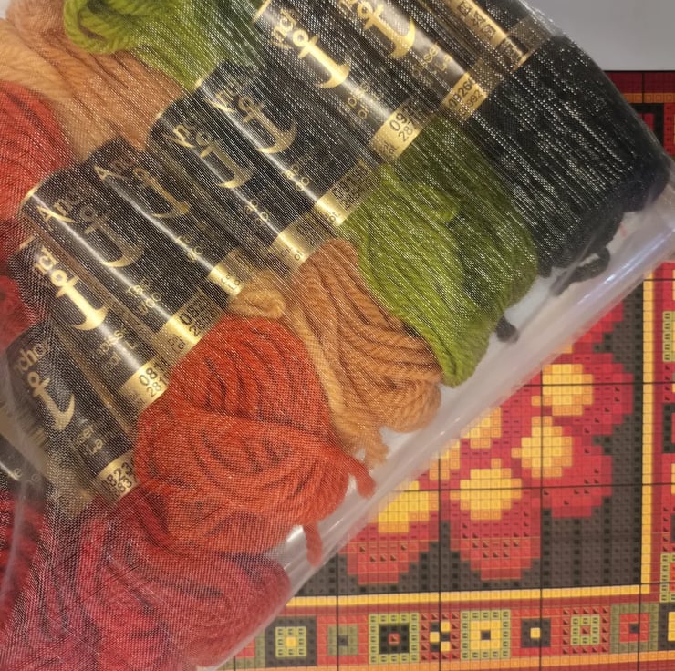 What wonderful rich autumnal colours in this Marigold Tile Tapestry kit, rich reds and golds sewn against a dramatic dark background.
