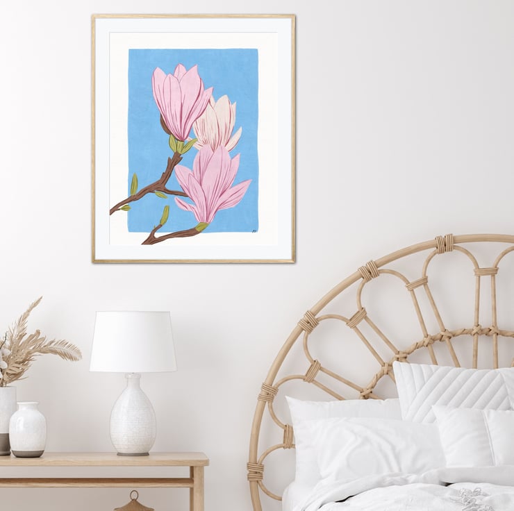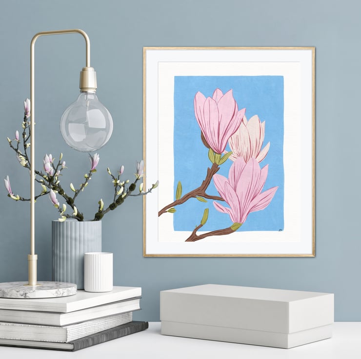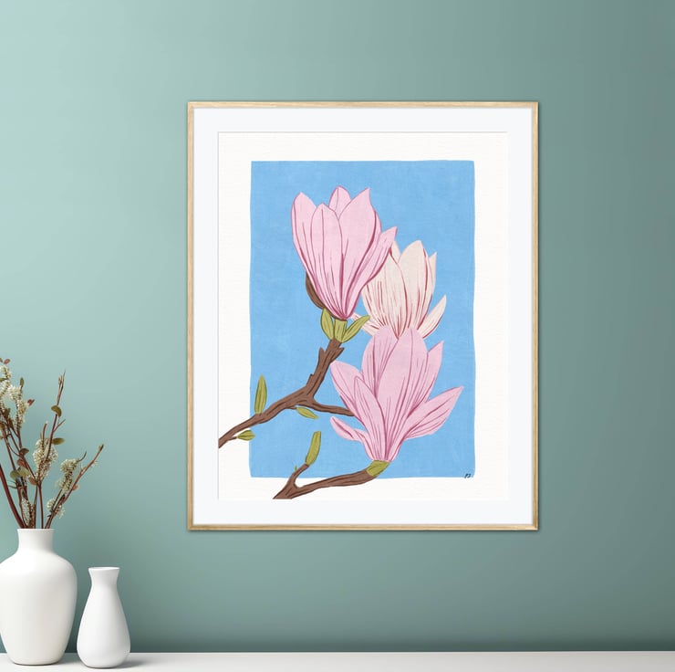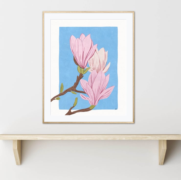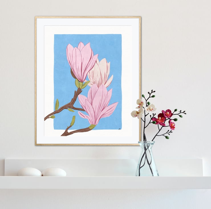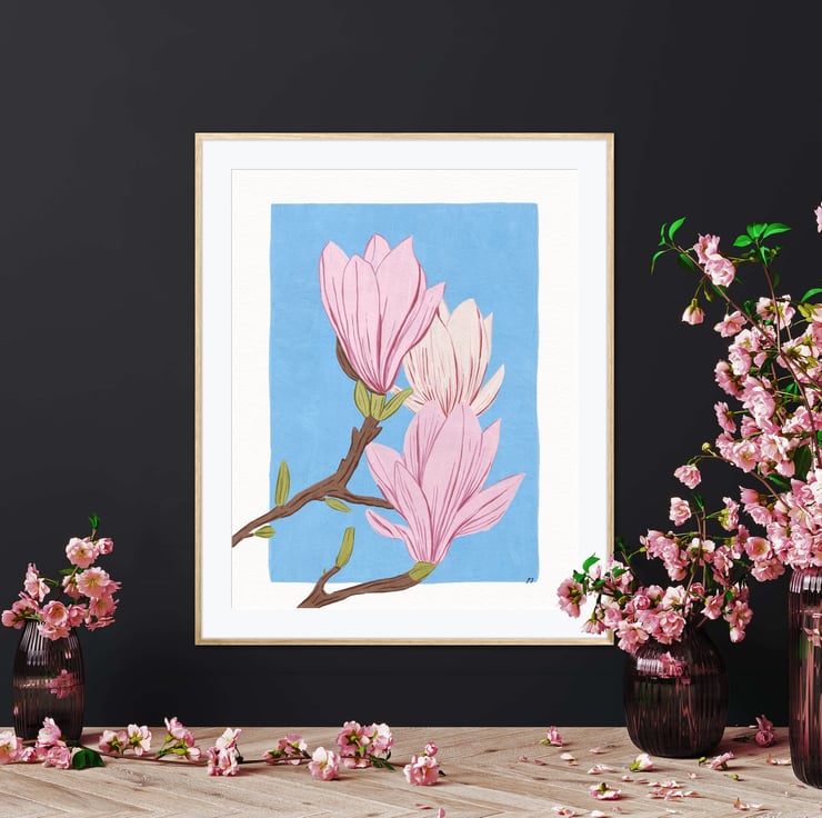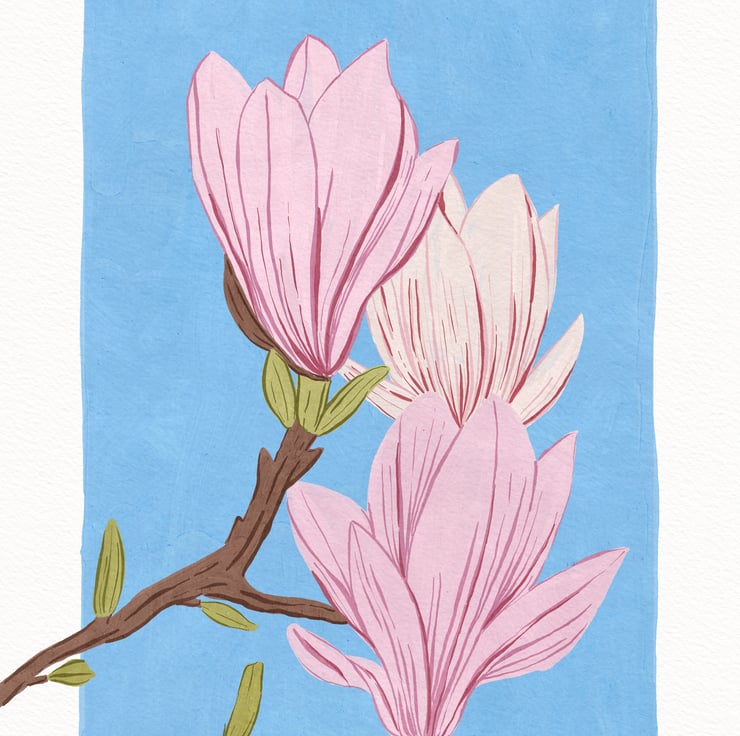 A close up illustration of a Magnolia tree branch with flowers with a Sky Blue background.