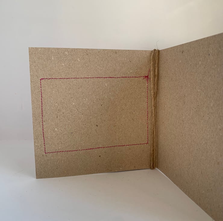The hessian is machine stitched, using a contrasting thread, onto a plain brown recycled card. This stitching is visible on the inside of the card.