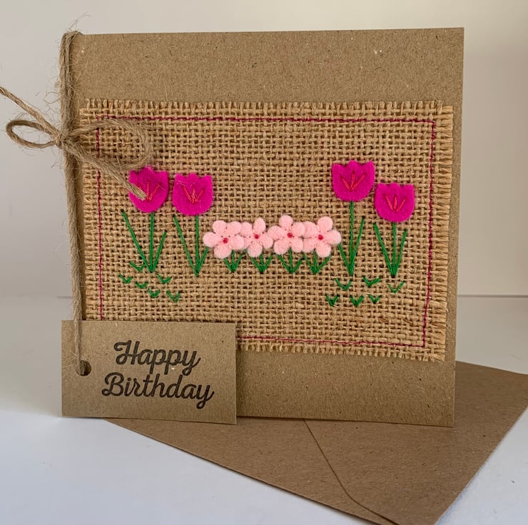 This unique handmade card is decorated with delicate flowers in fuchsia pink and pale pink. The decoration is hand cut from 100% wool felt. It is then sewn by hand onto a hessian background.