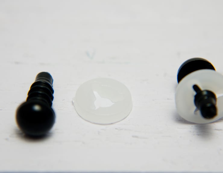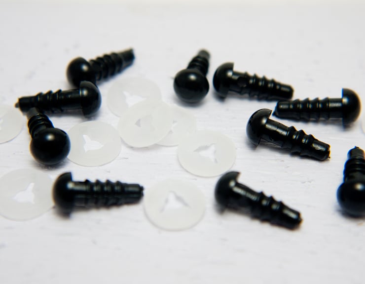 This purchase is for a pack of selected 10, 50, 100 pieces of 6mm safety eyes and the same number of backs. They are made of plastic and come with washers that have to be installed manually to secure the eyes. The eyes are solid black and can be used in any type of craft project.