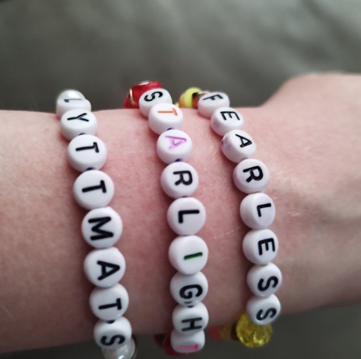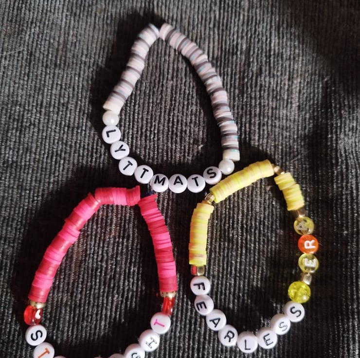 3 bracelets. the bracelets say FEARLESS, STARLIGHT, LYTTMATS (LOVE YOU TO THE MOON AND TO SATURN)