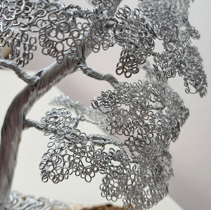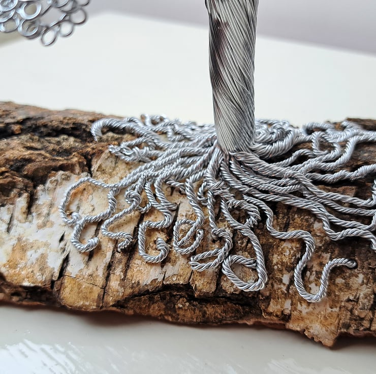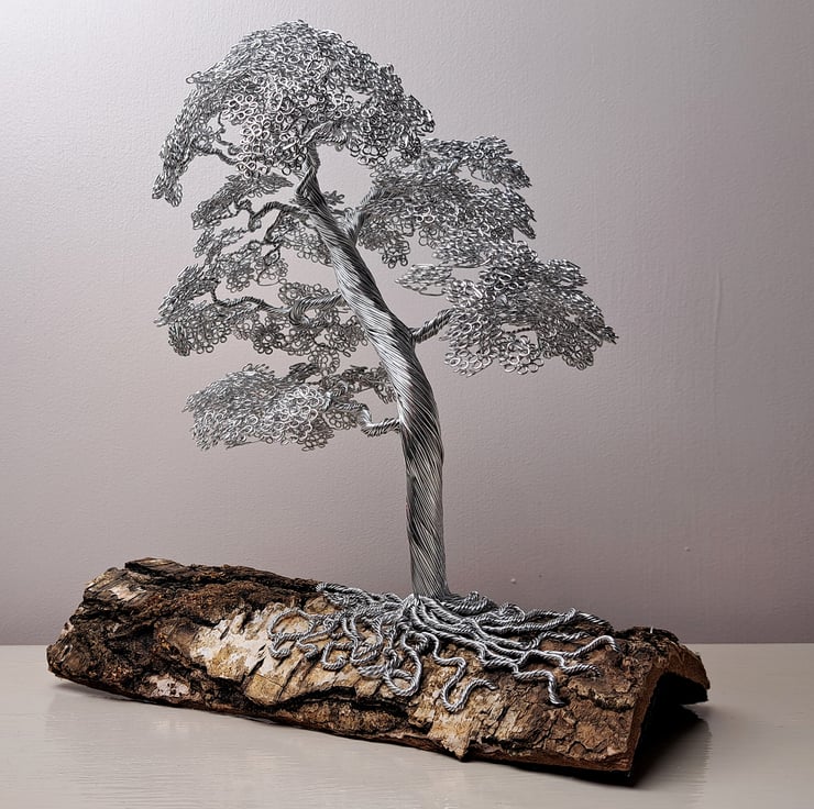 Two to three hundred separate strands of wire are cut to size then twisted together to form the trunk, roots and branches then it is looped to form the foliage.
