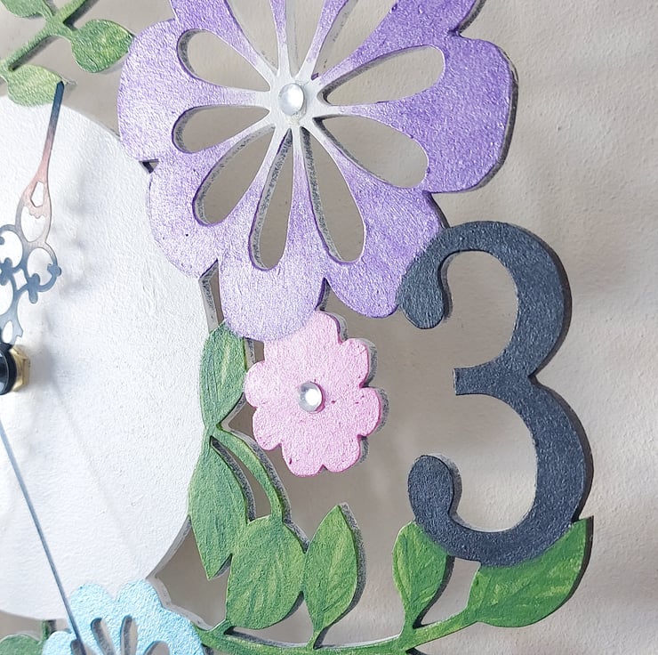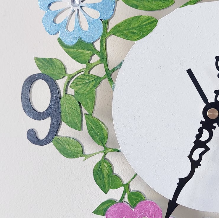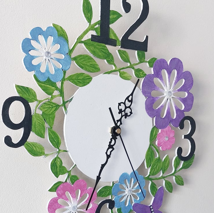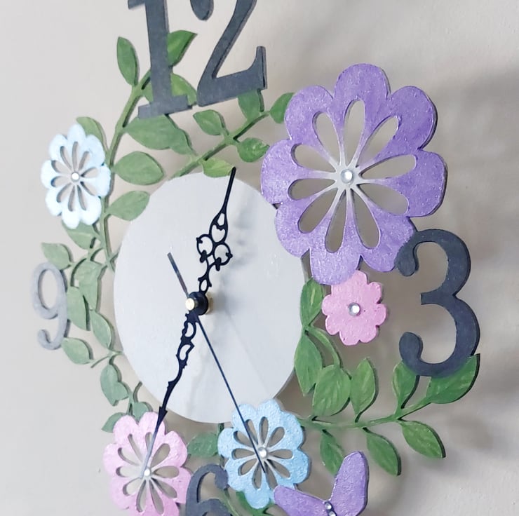 Handpainted floral and butterfly wall clock. Painted with pearlescent acrylic paints and decorated with diamanté. It is laser cut from mdf. It's a delicate clock with a silent clock mechanism.