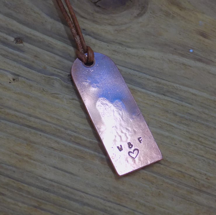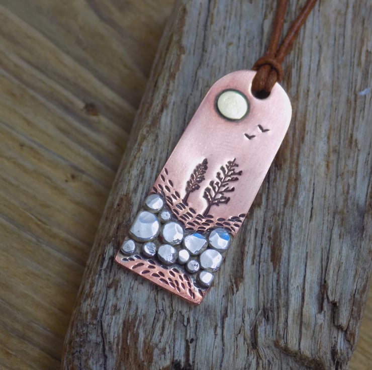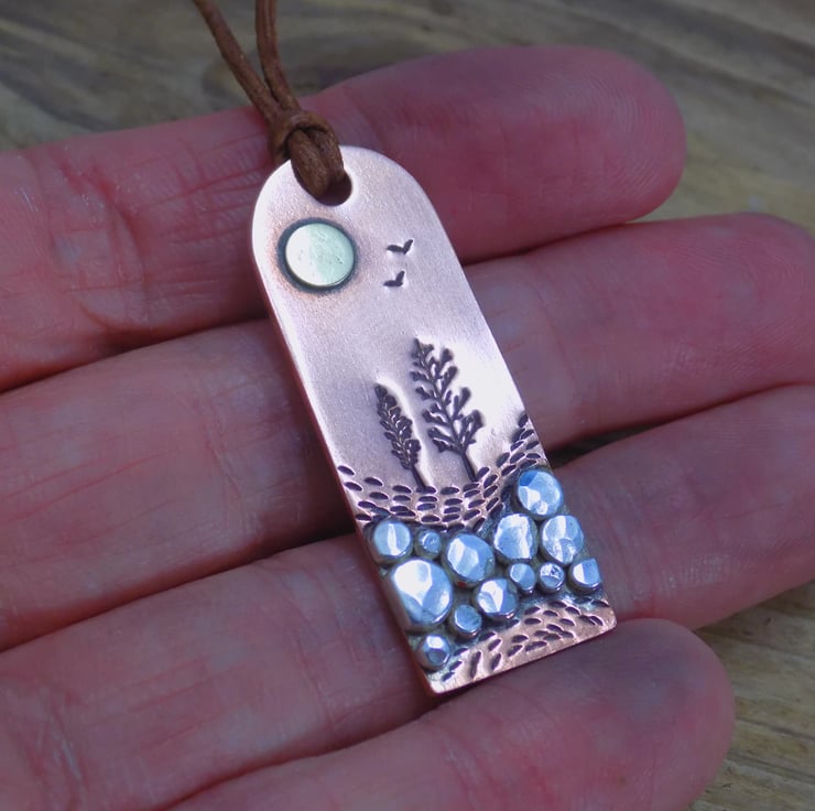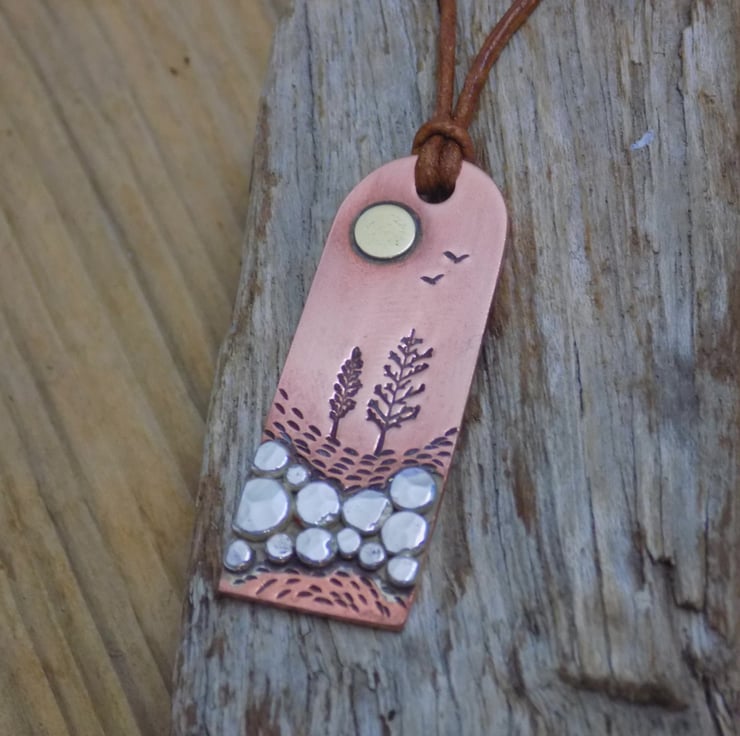 Made from copper, silver and brass. The foreground has been made from lots of little melted silver 'rocks' which have been soldered onto the copper and given some texture. The rest of the scene has been added with tree punches and individual marks to add detail and depth. Finally a brass sun and two little birds set the scene. Simply threaded onto vintage brown leather cord, adjustable from 18 -20 " in length with lobster clasp closure. If you need a custom length, please get in touch.