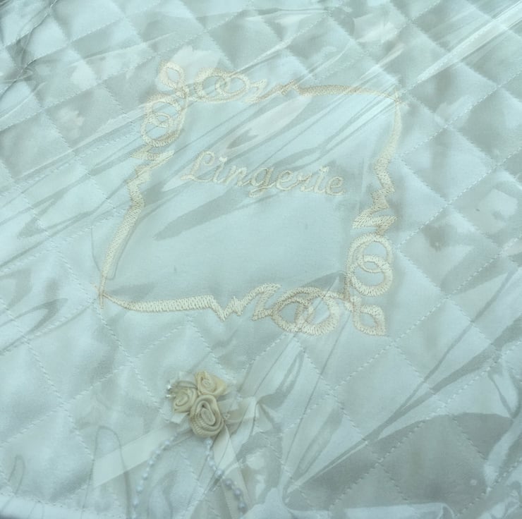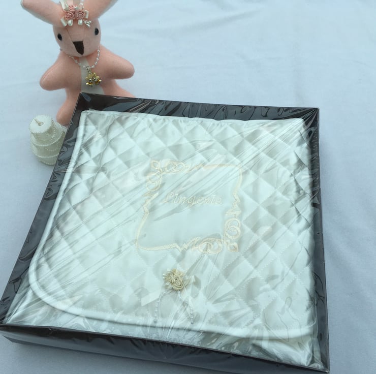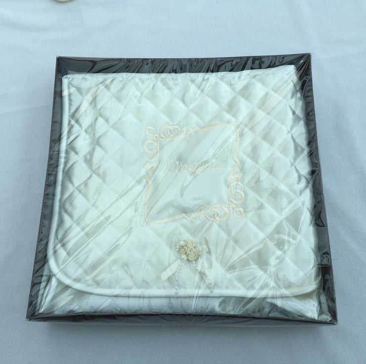 A pretty, satin fabric case for a Bride’s lingerie, before and after the wedding. It has a quilted flap, embroidered with ‘ Lingerie ‘ in Ivory thread. Useful on honeymoon or future anniversary holidays to keep finer items together in the suitcase. It is approximately 12” square and comes in a gift box.
