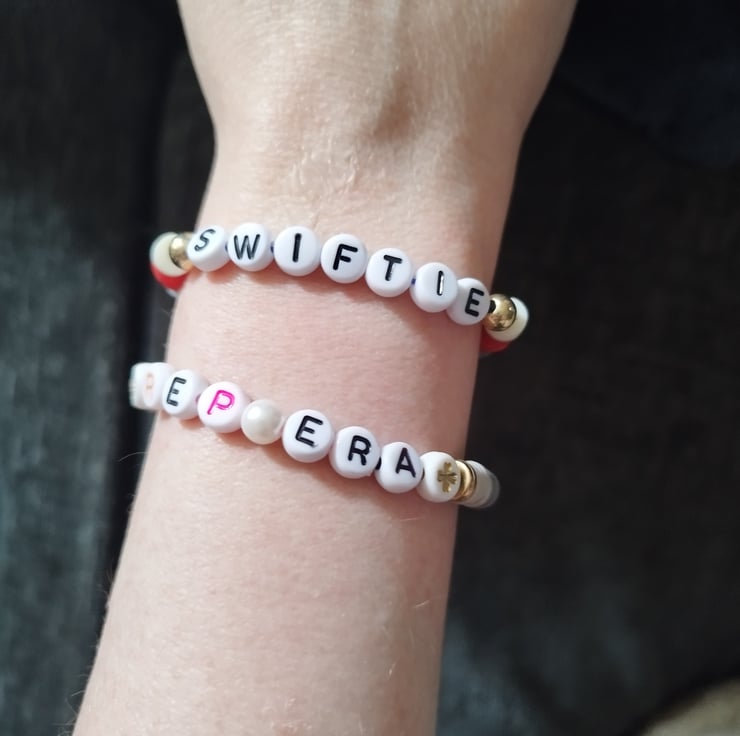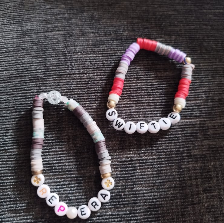 2 Taylor Swift Bracelets. They say SWIFTIE and REP ERA. made from clay beads.