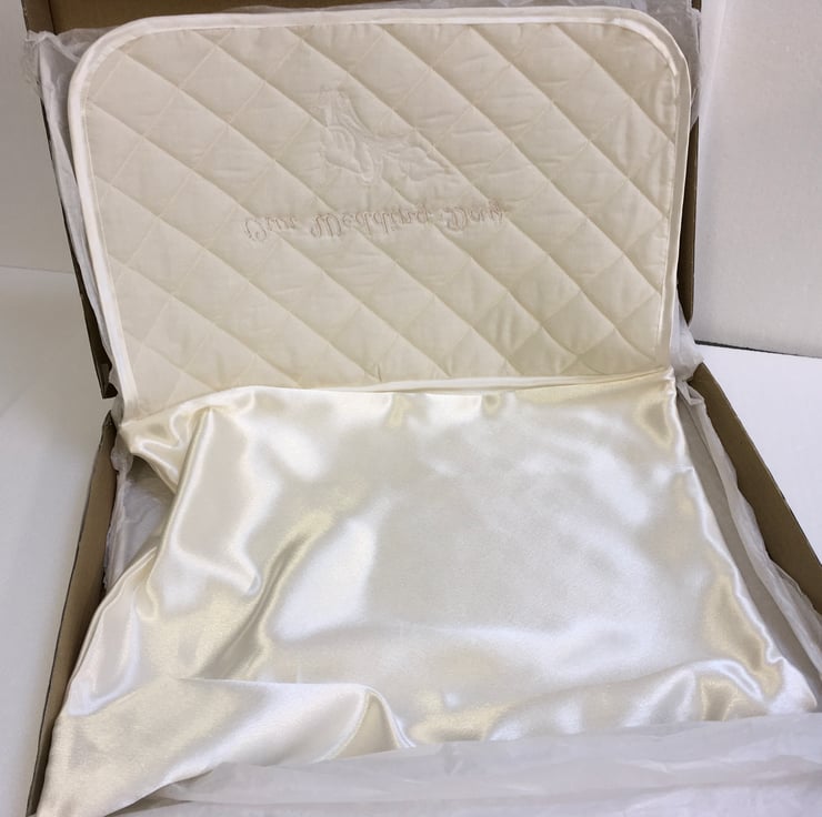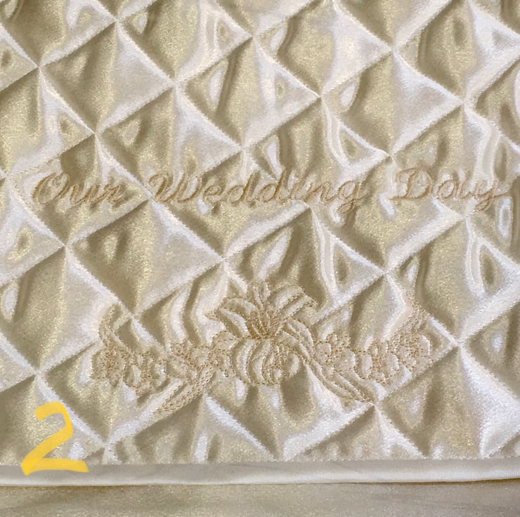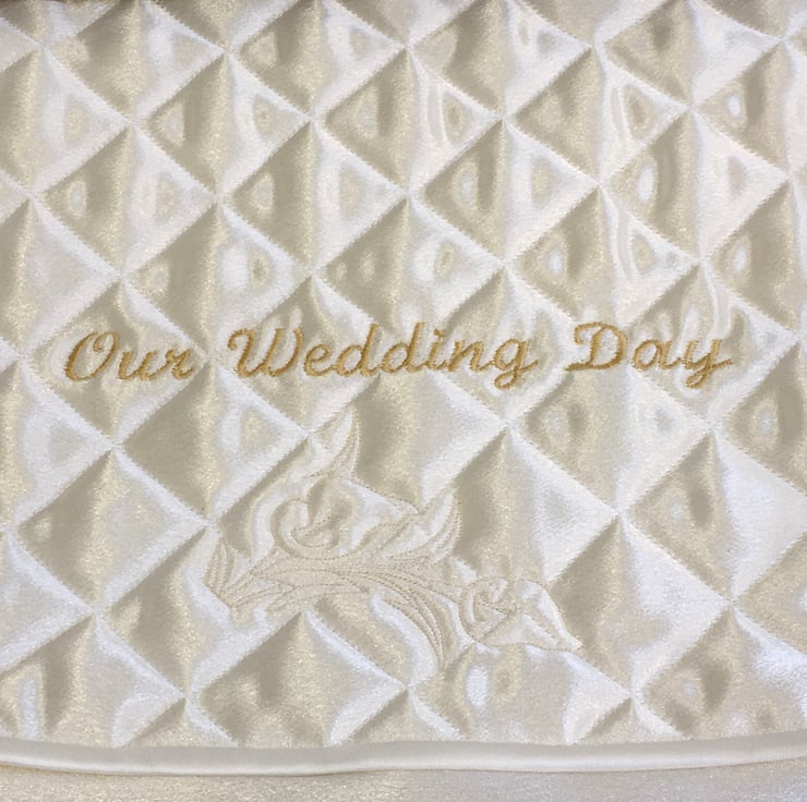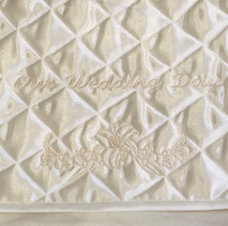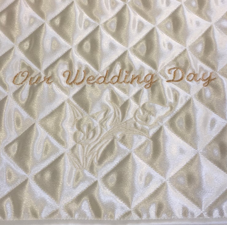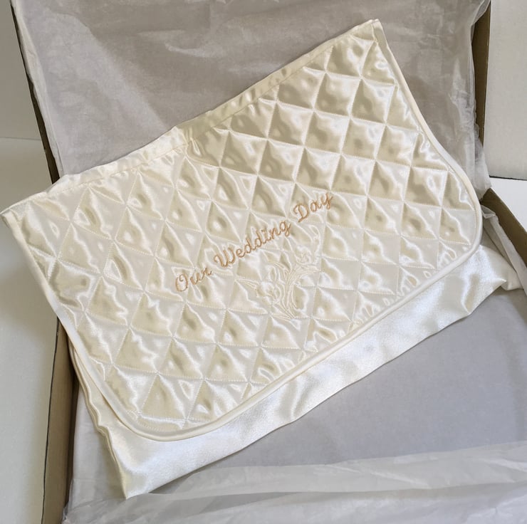 This Satin fabric case with an embroidered and quilted flap is for a Bride’s reminders of her and her husband’s Special Day. The embroidered design is ‘ Our Wedding Day ‘ with a floral motif underneath. The size is 16” x 14” and will hold all sorts of memorabilia such as a veil, tiara, garter, cake topper, wedding invitations and replies etc. All things that will mean a lot when looked at in the future, on a walk down Memory Lane.